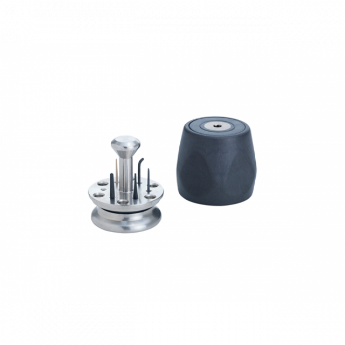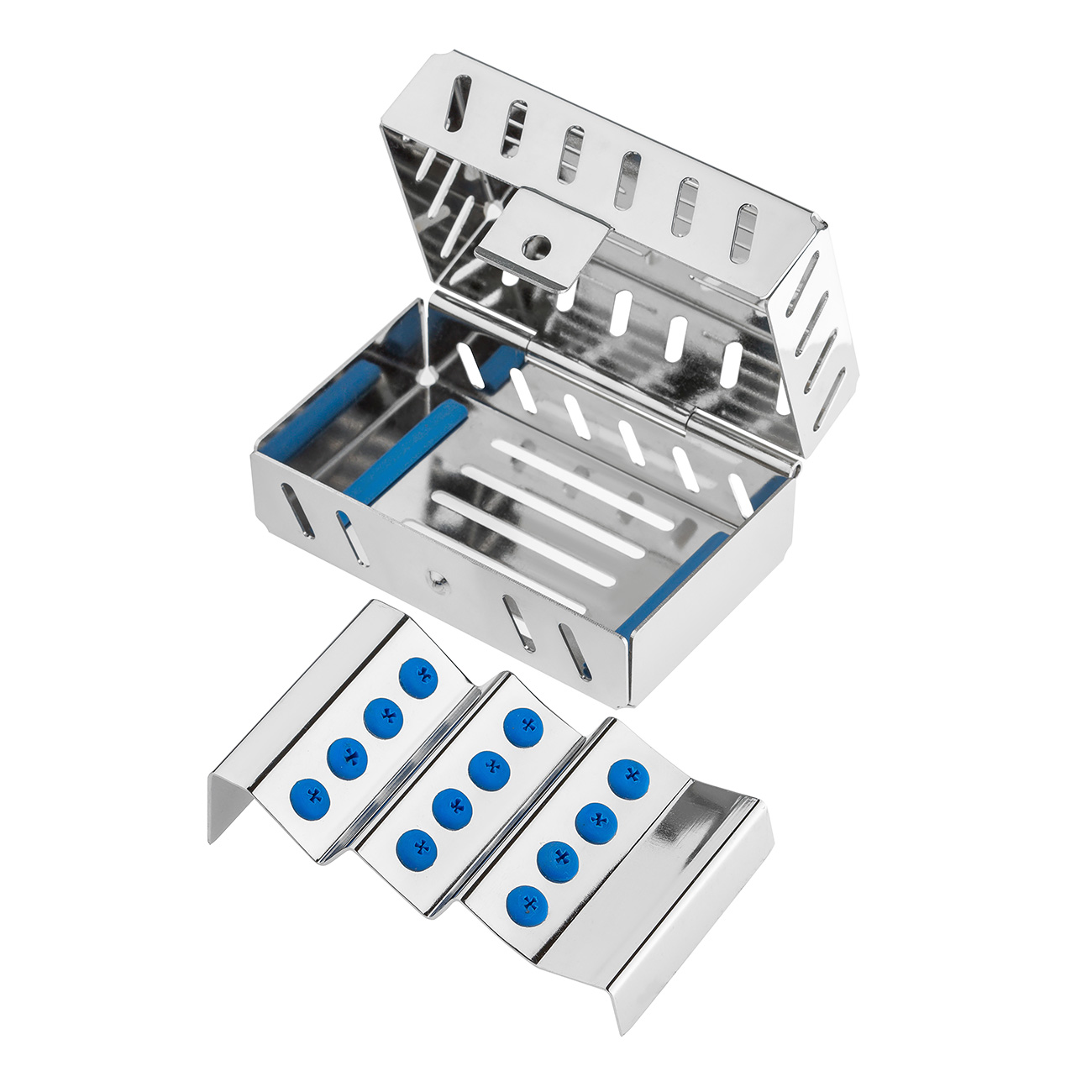 Стоматологический лоток представляет собой емкость прямоугольной формы с плотно прилегающей перфорированной крышкой и поддоном с силиконовыми держателями инструментов в количестве 12 штук. Угловое положение поддона с держателями позволяет стерилизовать боры не только под угловые, но и прямые наконечники. Благодаря специальной форме силиконовых фиксаторов инструменты не скользят в контейнере и надежно защищены от повреждений во время транспортировки.