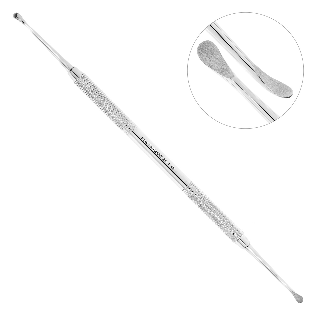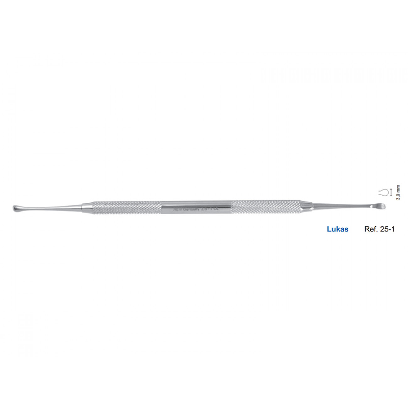 Двухсторонняя прямая кюретажная ложка Lukas с диаметром рабочих частей 3 мм применяется в стоматологической практике для выскабливания остаточных фрагментов кости, кист и грануляционных тканей после удаления передних зубов. Удобная небликующая рукоять с матовой насечкой хорошо передает нажим на рабочую часть инструмента, что позволит лучше очистить зубную лунку.