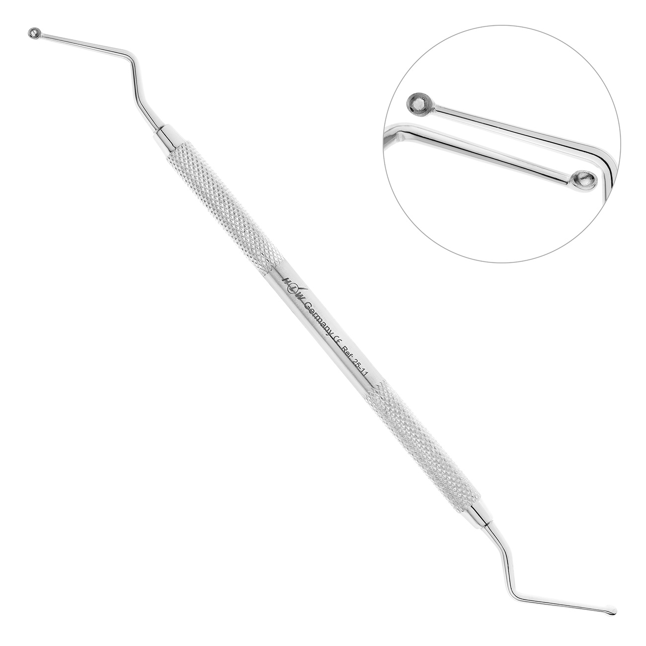 "Назначение:" используется для проведения кюретажа в пародонтологии и пародонтологической хирургии. Помогает удалить зубной камень и налёт из труднодоступных мест, а также очистить поверхность корня зуба от грануляций и других патологических образований.