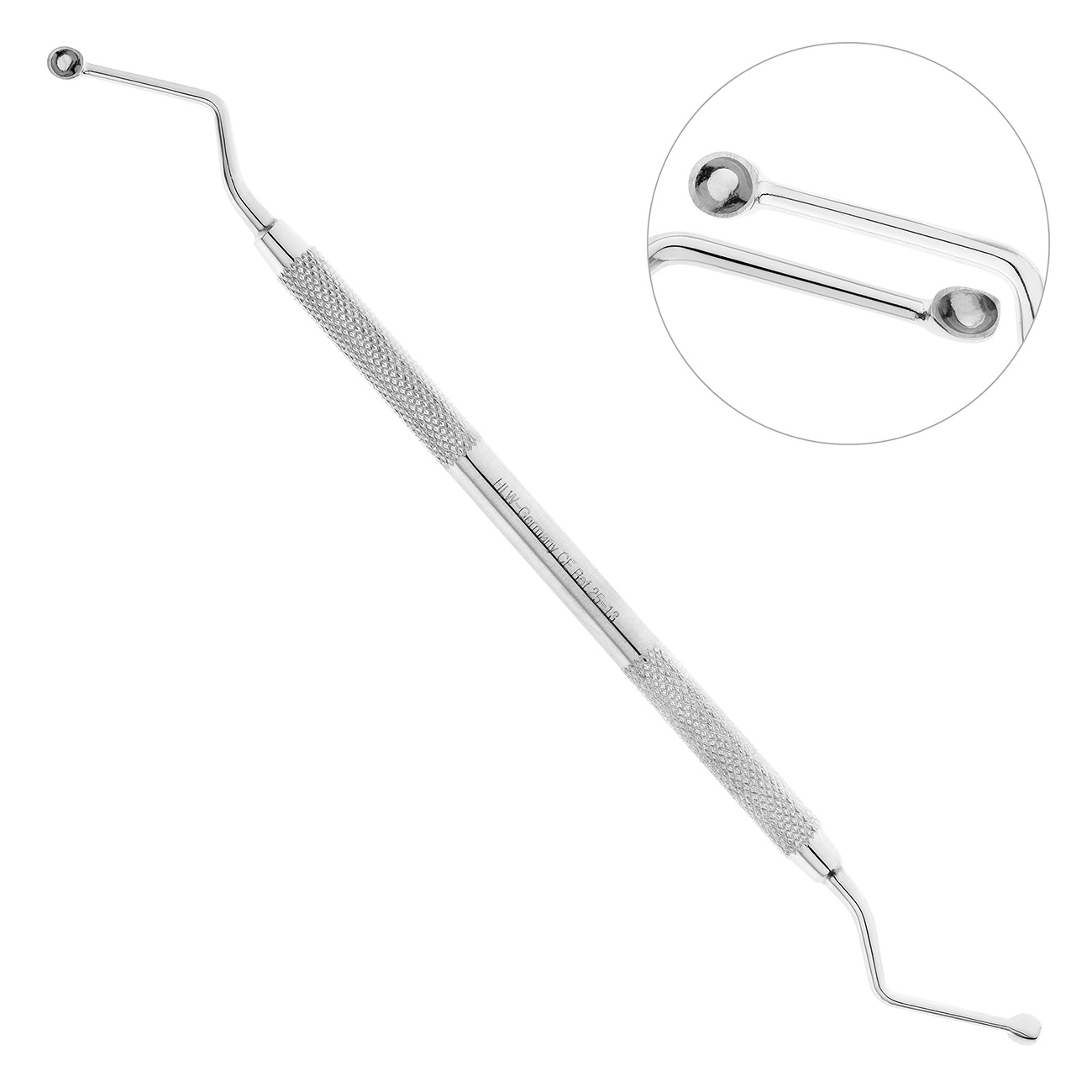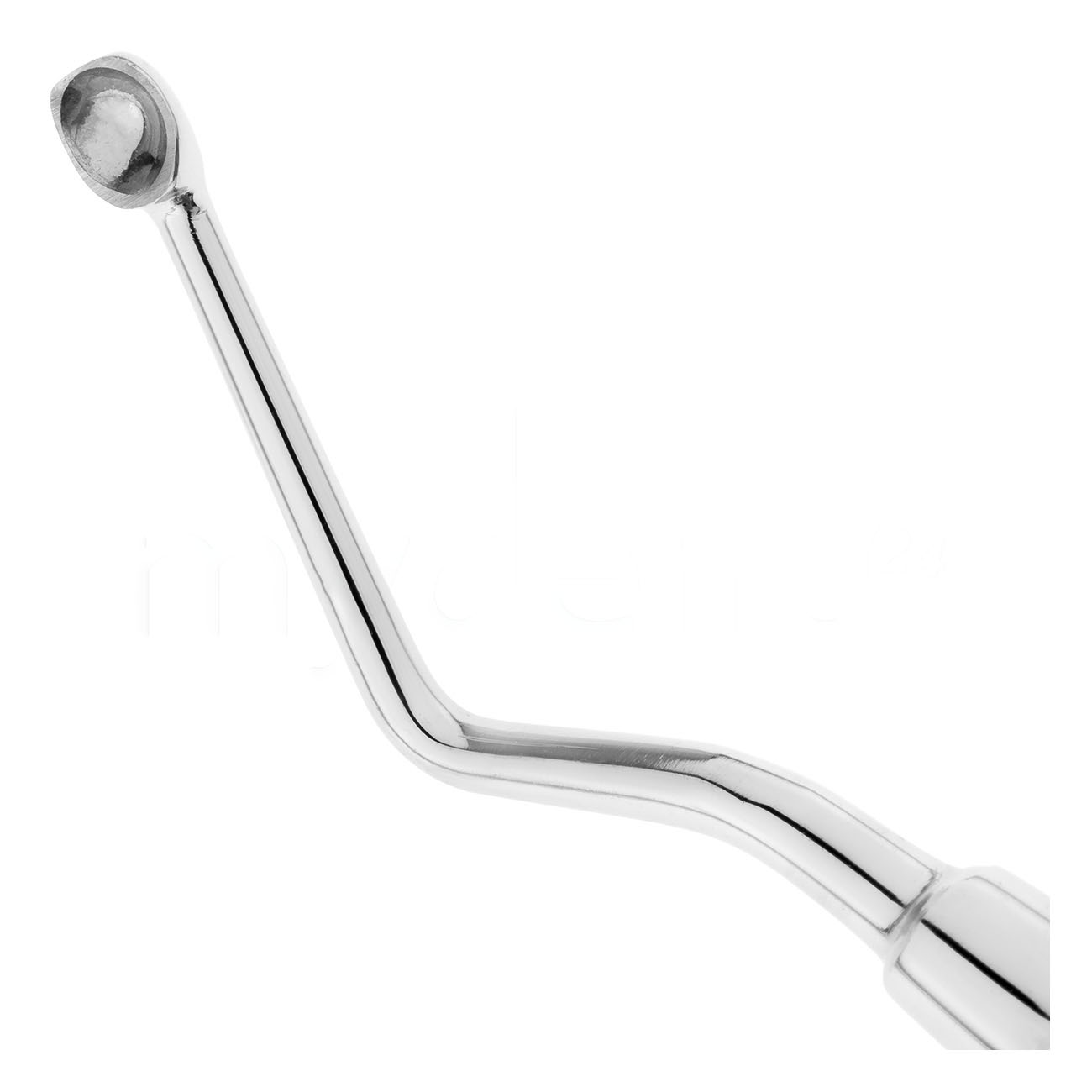"Назначение:" инструмент предназначен для удаления грануляций, размягчённого цемента и зубного камня из пародонтальных карманов при проведении кюретажа. Ложка имеет круглую форму и изогнутую конструкцию, что обеспечивает удобство и точность работы.