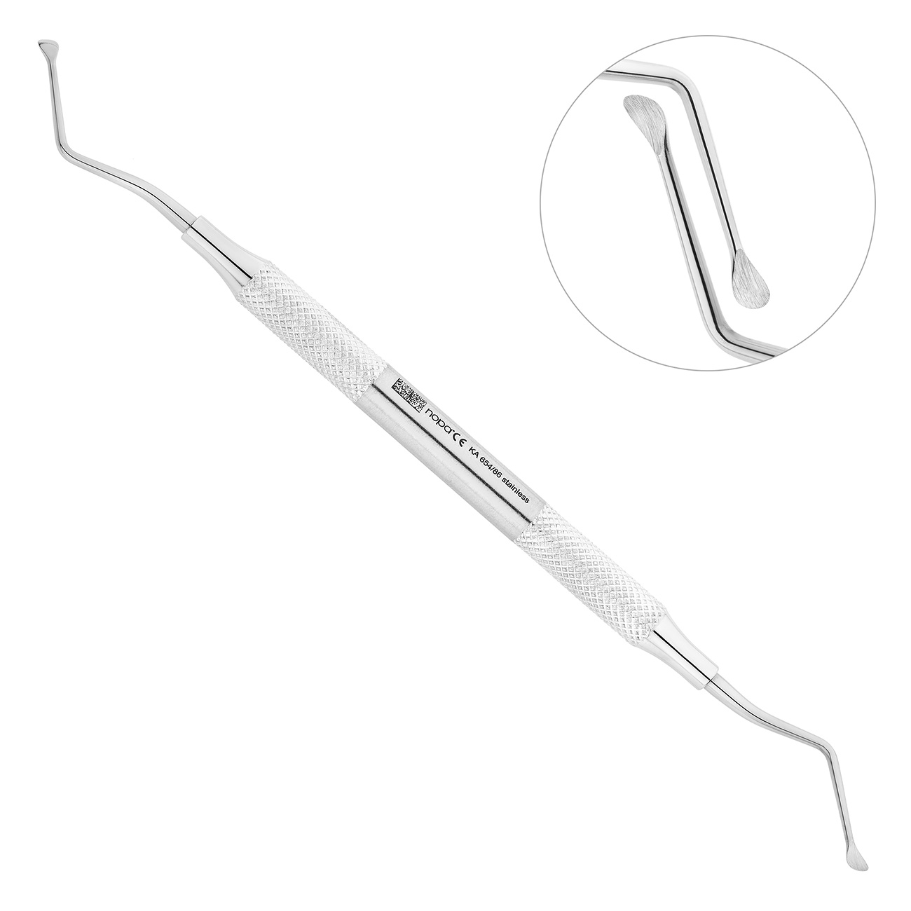 Ручка инструмента двусторонняя. С обоих концов рукоятки расположены зеркально отраженные рабочие части, кончики которых представляют собой слегка изогнутые плоскости каплевидных форм с острыми гранями. Такая конструкция инструмента позволяет выскабливать пораженную костную ткань и эффективно удалять грануляции из лунок удаленных зубов.