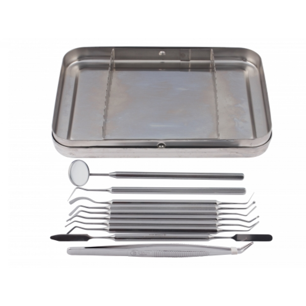 Набор стоматологических инструментов изготовлен из пищевой стали. Длительный срок службы обеспечен коррозионностойкими, устойчивыми к стерилизации материалами. Предметы помещены в большой контейнер для хранения. Включает инструменты для полной диагностики и лечения.