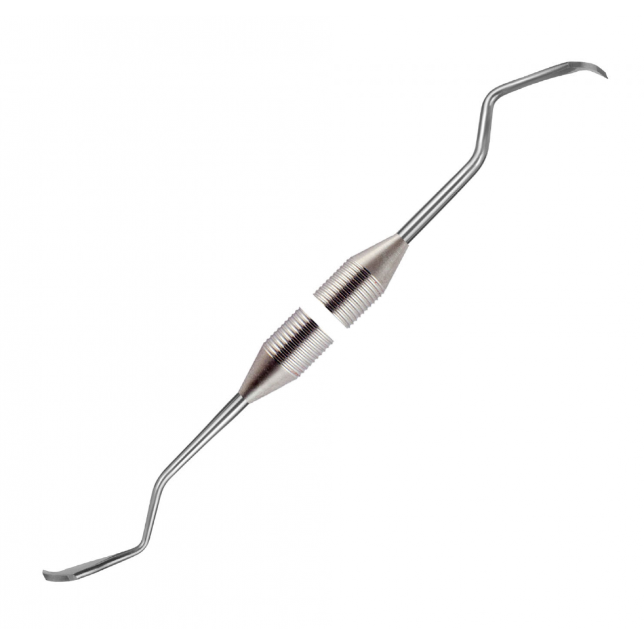 Изогнутое дистальное долото №1 09-02 - двусторонний стоматологический инструмент, который предназначен для работы с костью и твердыми тканями зуба, особенно в дальних и труднодоступных областях. Инструмент также позволяет удалять зубной камень с межзубных поверхностей и обрабатывать корневые поверхности.