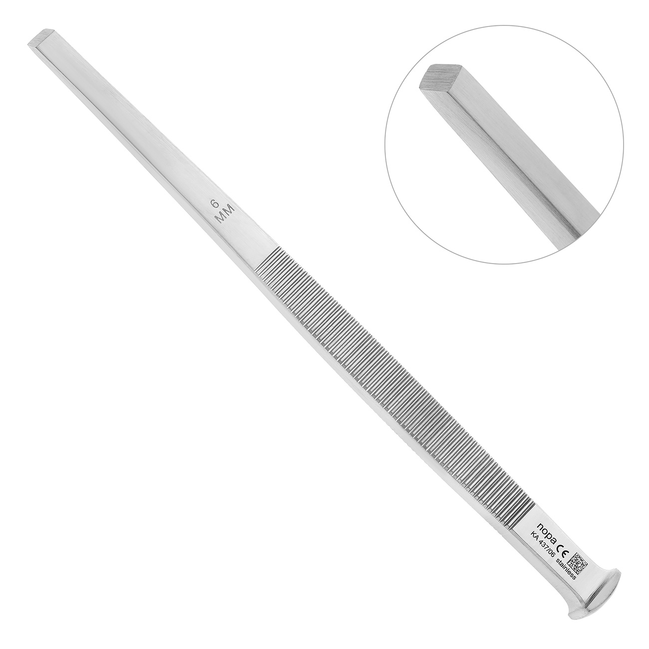Поперечные ретенционные полосы на обоих сторонах долота способствуют отличной фиксации инструмента, что снижает нагрузку на руку при проведении операции.