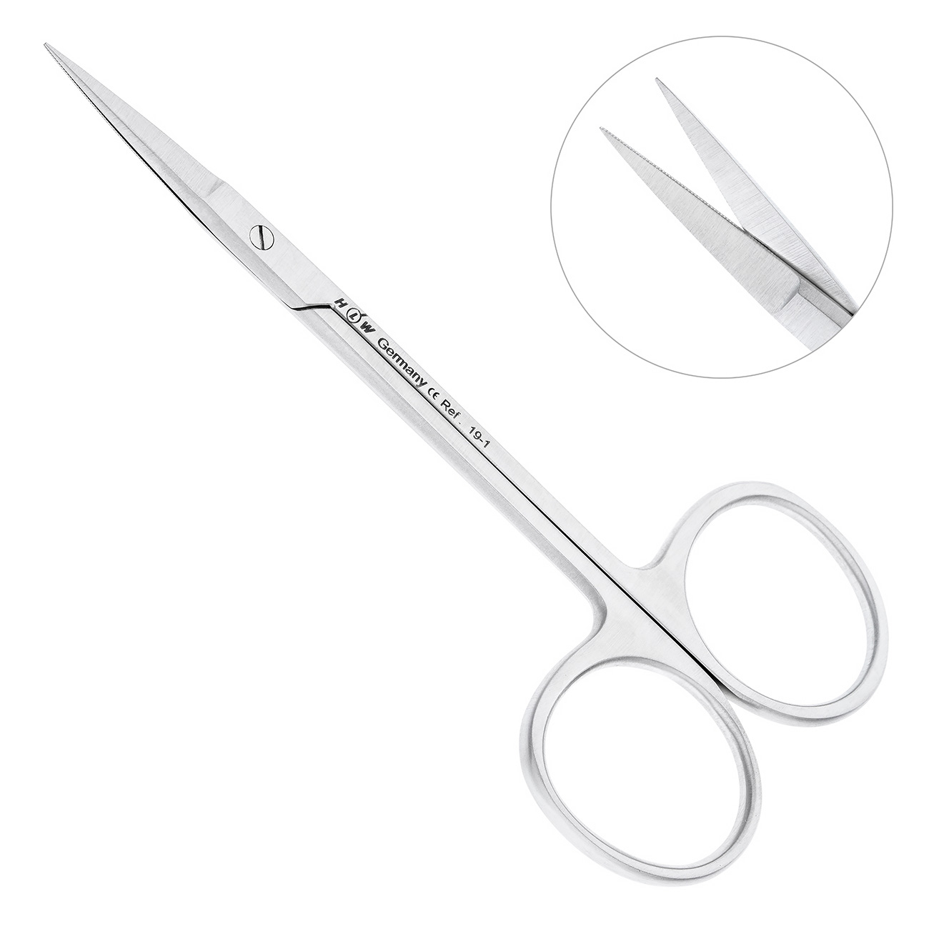 Зубчатые хирургические ножницы HLW 19-1 типа Iris с тонкими прямыми лезвиями и острыми кончиками предназначены для выполнения микрохирургических процедур в стоматологии, связанных с рассечением слизистой оболочки и мягких тканей десны. Благодаря зубцам на одном из лезвий ножницы 19-1 одинаково хорошо разрезают мягкие ткани и шовный материал без лишнего скольжения.