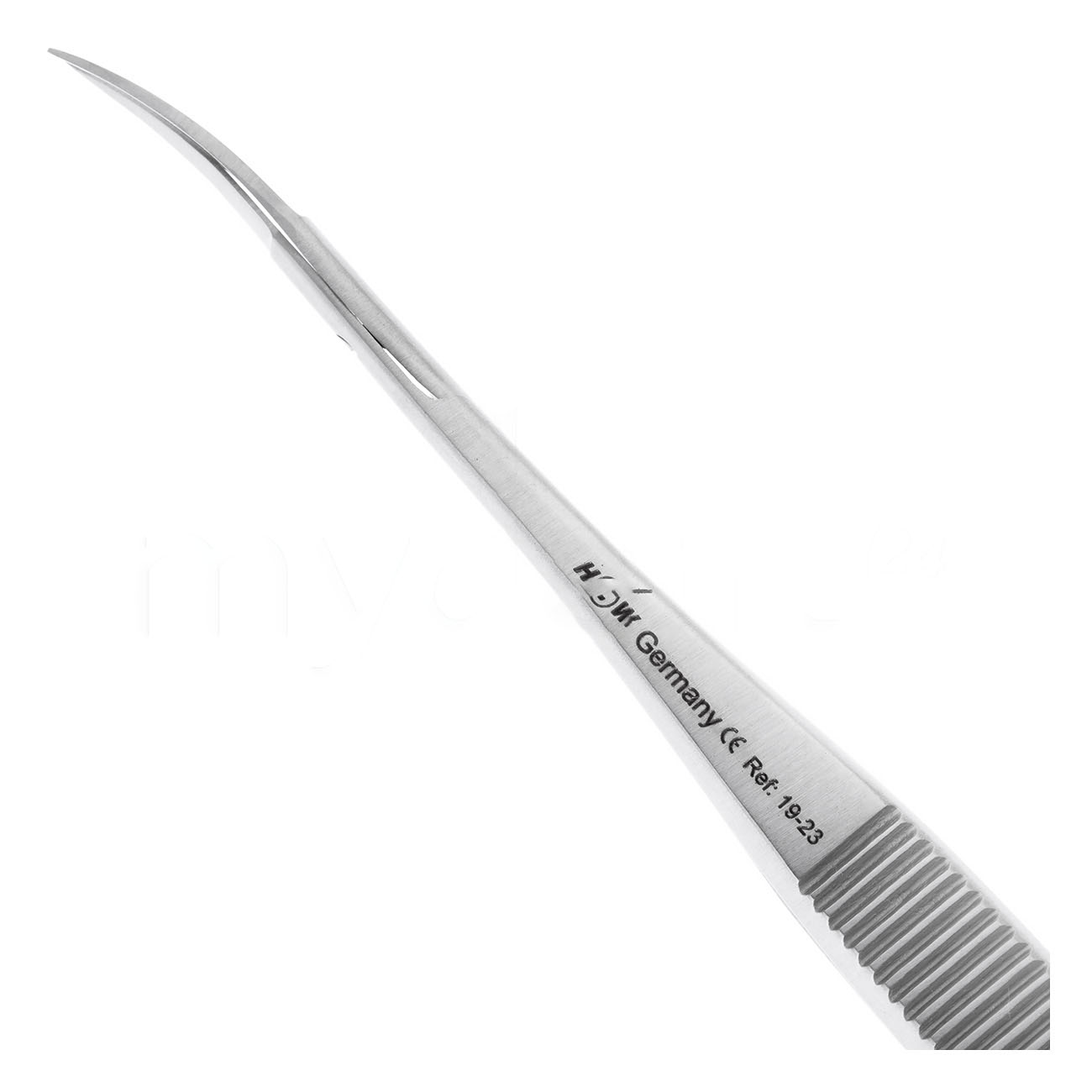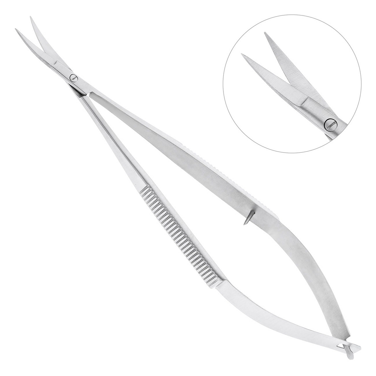 "Назначение:" используются для рассечения тканей, кожи, сосудов и других материалов в ходе микрохирургических операций. Изогнутая форма лезвий позволяет точно и аккуратно выполнять разрезы, минимизируя повреждение окружающих тканей.