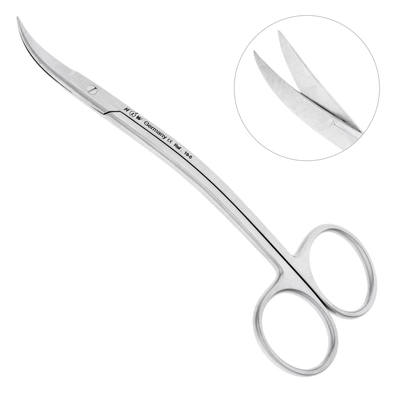 Ножницы для гингивэктомии HLW 19-8 типа La Grange используются для препарирования тканей десны и грануляционных тканей в полости рта. Двойной S-образный изгиб ножниц 19-8 упрощает проведение операций вокруг зубного ряда и на труднодоступных участках десны. Зубцы на одной из режущих кромок позволяют лучше удерживать и рассекать мягкие ткани и шовный материал без лишнего скольжения и повреждения слизистой оболочки вокруг.