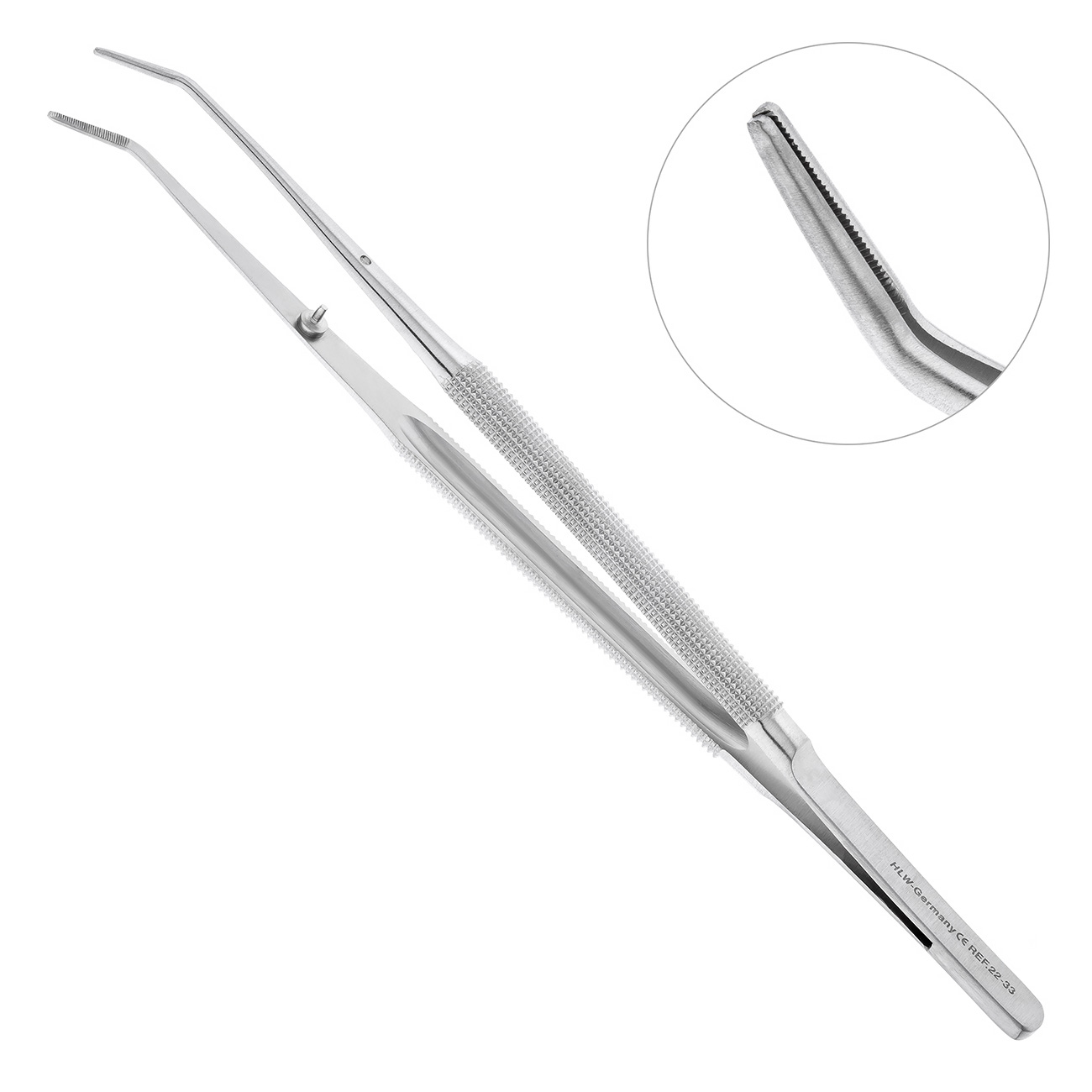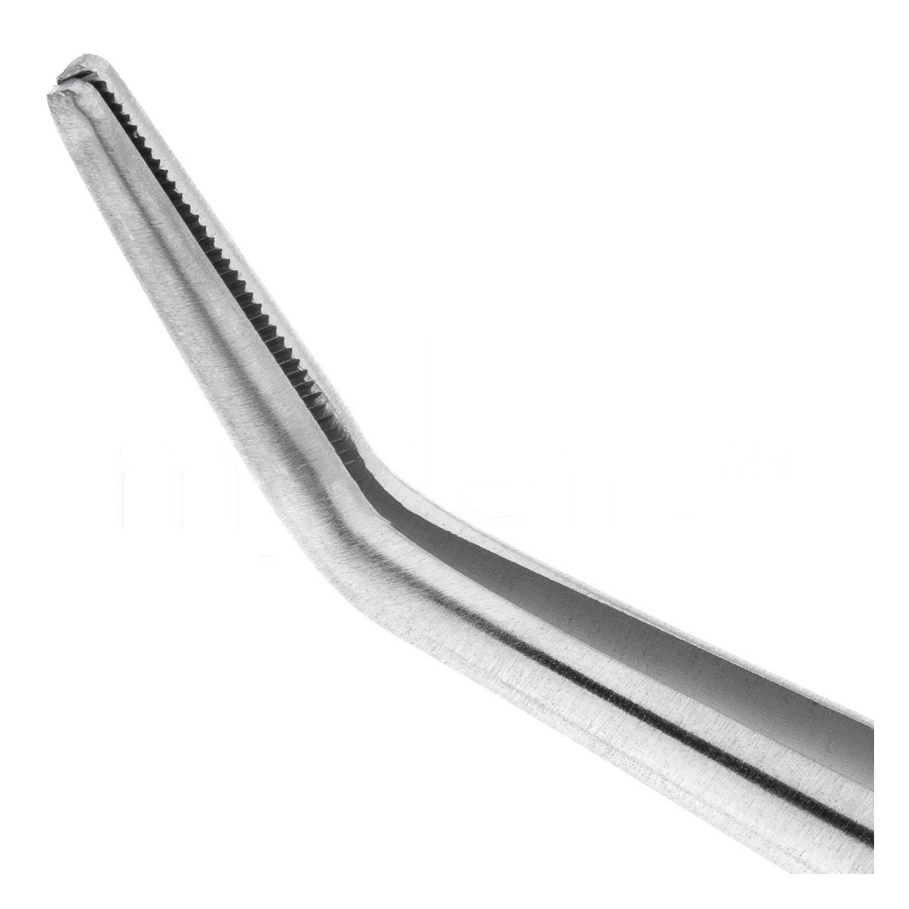 "Назначение:" инструмент используется для захвата и удержания мелких предметов, таких как нити, ватные тампоны, а также для проведения микрохирургических процедур. Изогнутая форма пинцета позволяет точно манипулировать в труднодоступных местах.
