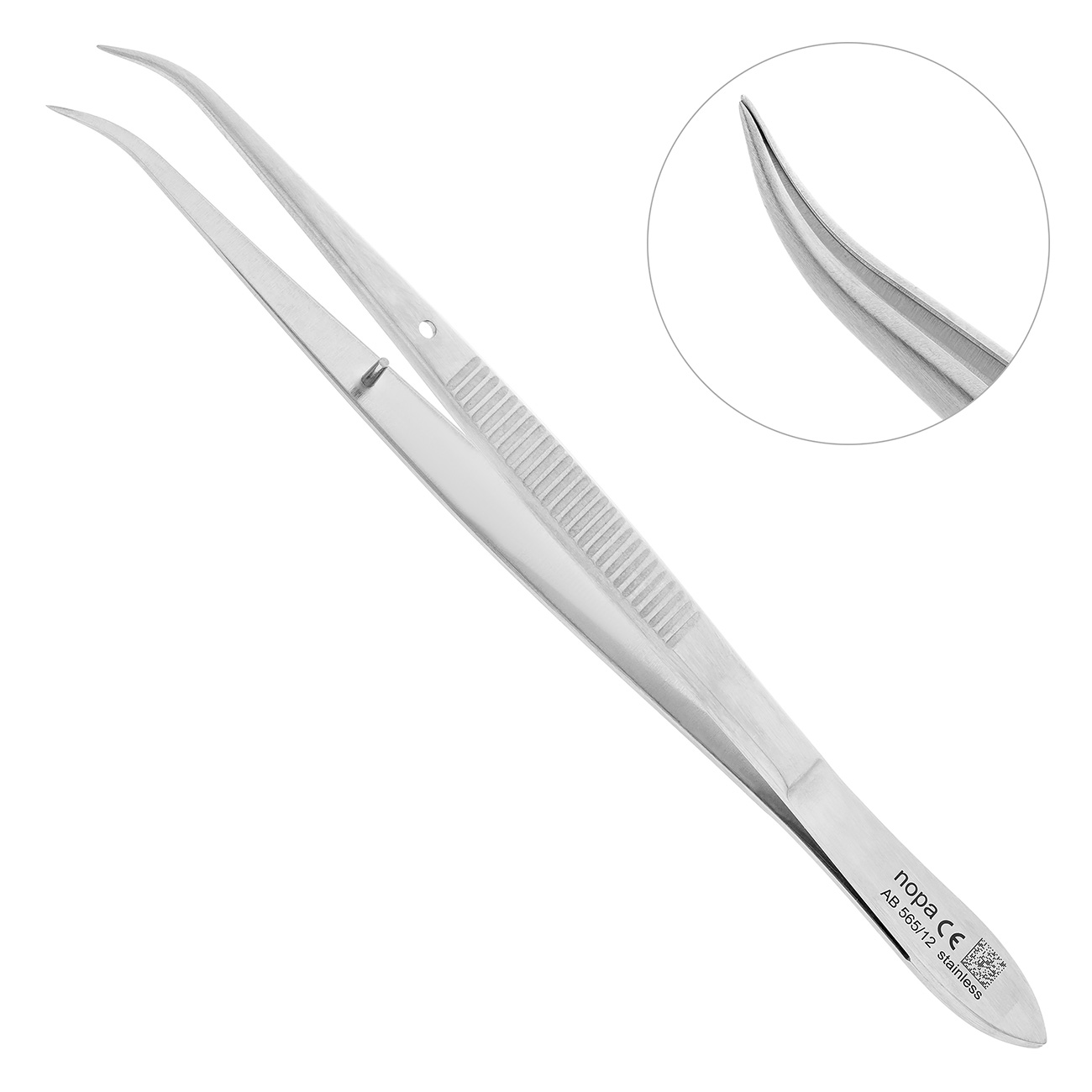 Внутренняя поверхность рабочей части инструмента гладкая, без ретенционного узора и имеет серповидный изгиб. Кончик бранши заостренный и тонкий, что позволяет использовать пинцет эффективно в любой зоне полости рта.