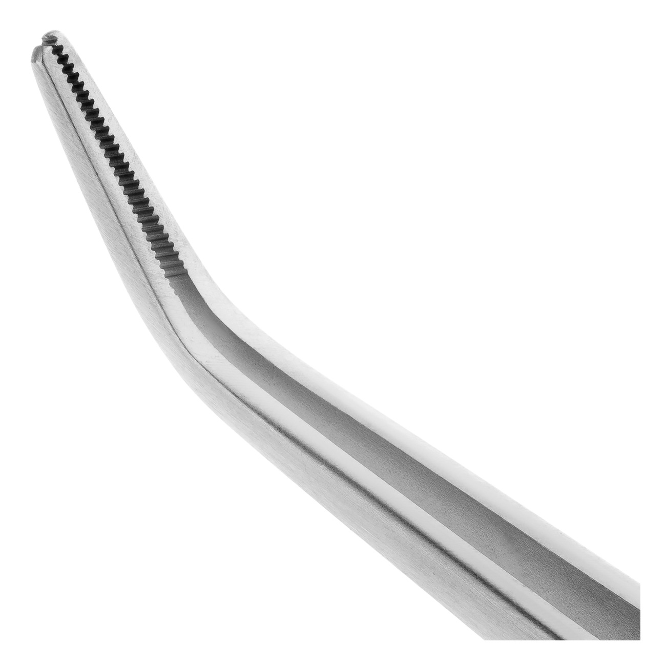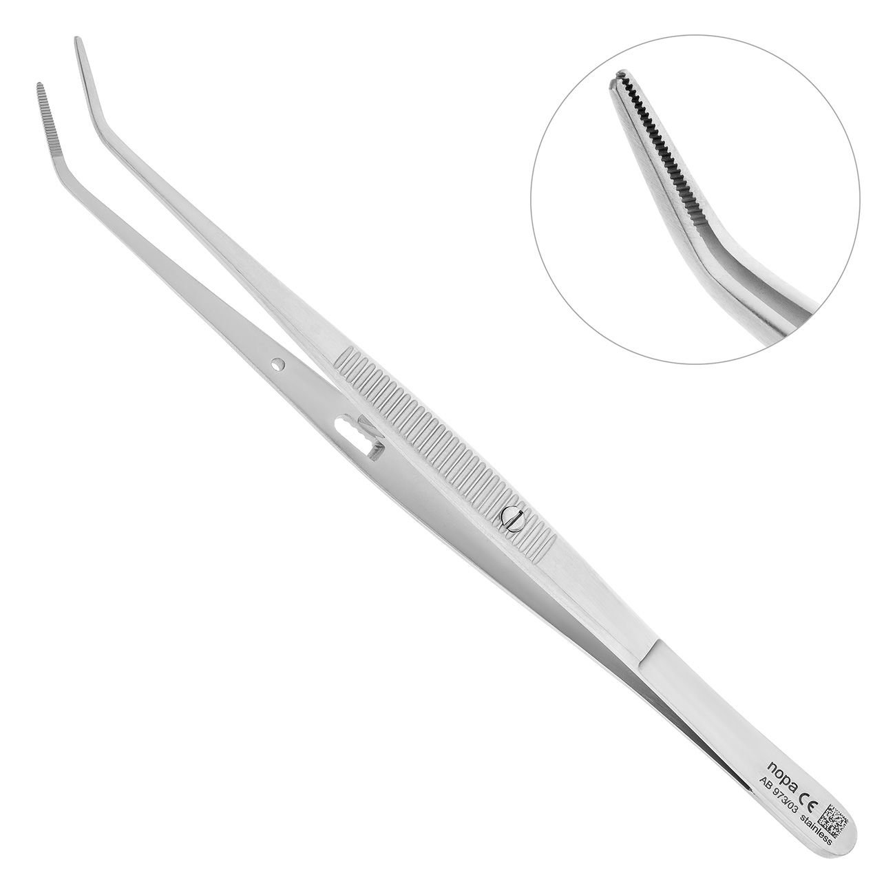 Поперечные насечки на внутренних поверхностях браншей пинцета надежно захватывают и фиксируются на поверхности рабочего материала. Изгиб рабочей части по плоскости инструмента способствует введению анатомического пинцета в глубокие и труднодоступные участки полости рта. Тонкие и узкие бранши обеспечивают хорошую визуализацию операционного поля.