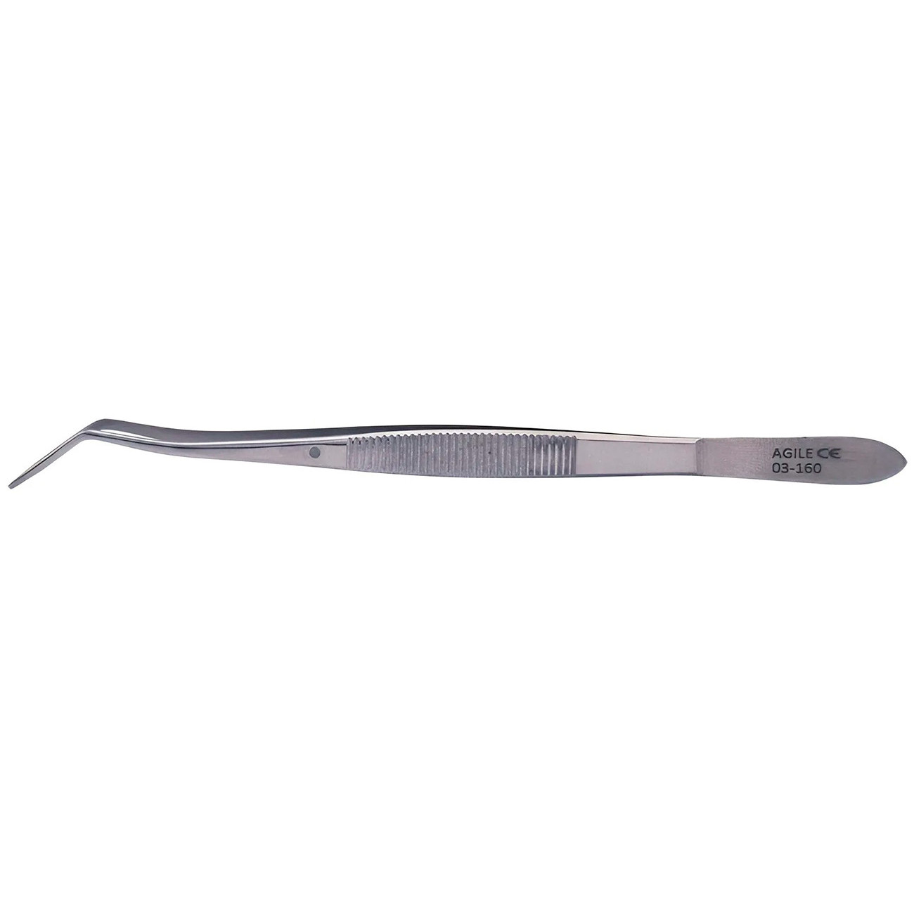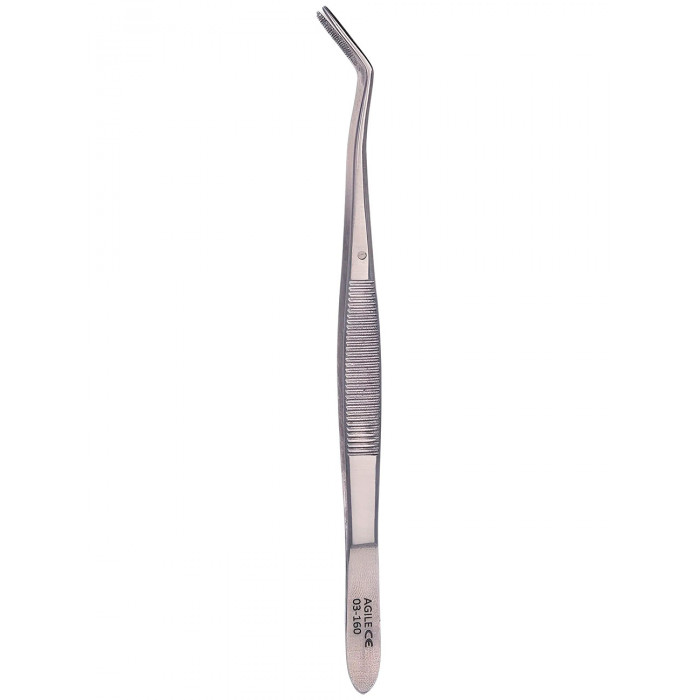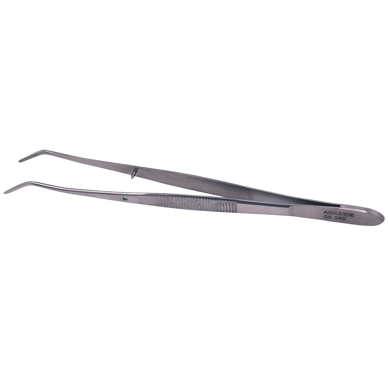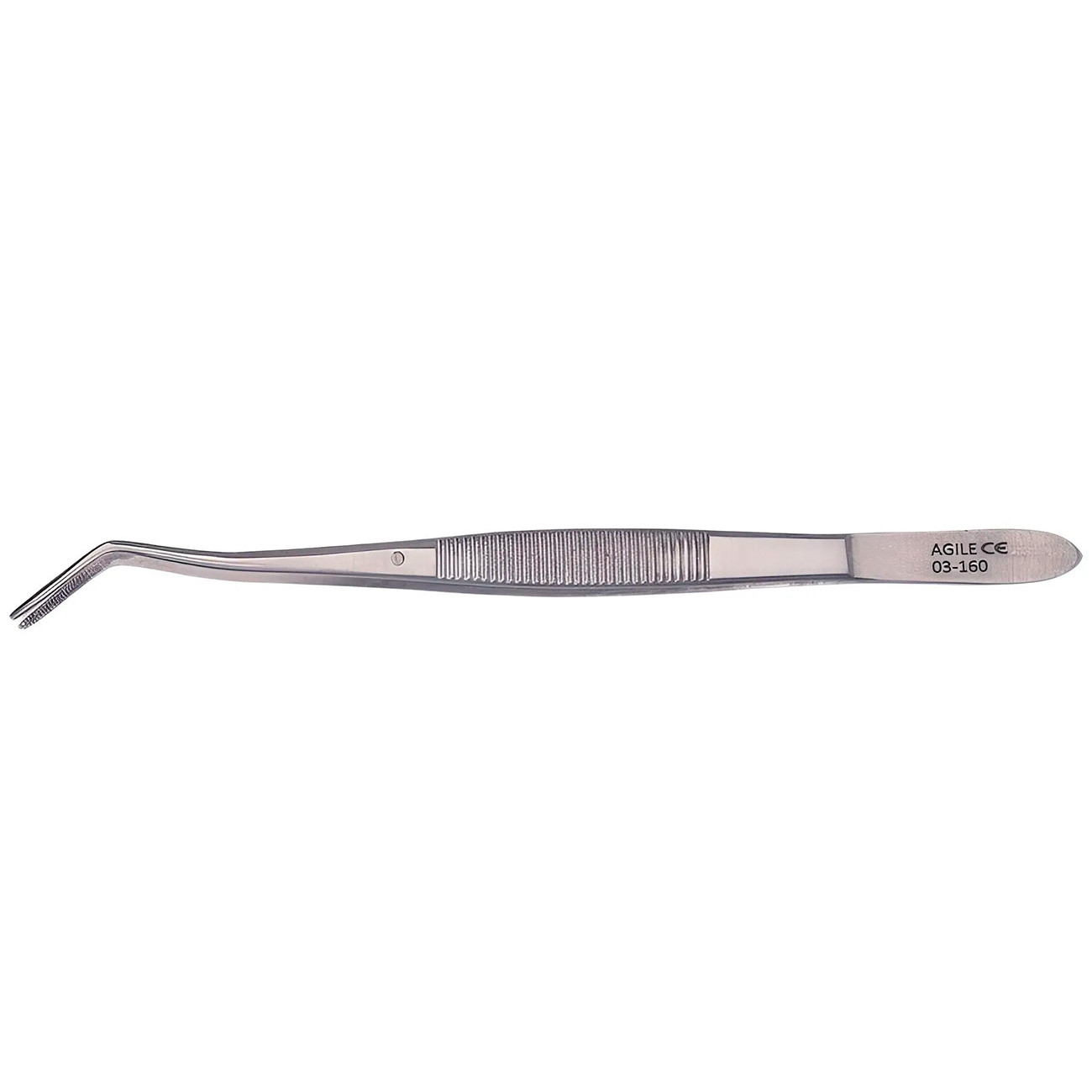 Стоматологический фиксирующий пинцет AGILE Meriam 03-160 с двойным изгибом и поперечно зазубренными рабочими поверхностями применяется для прочного захвата и фиксации скользящих тканей десны, остановки небольших кровотечений и удаления отсеченных тканей при проведении хирургических операций.