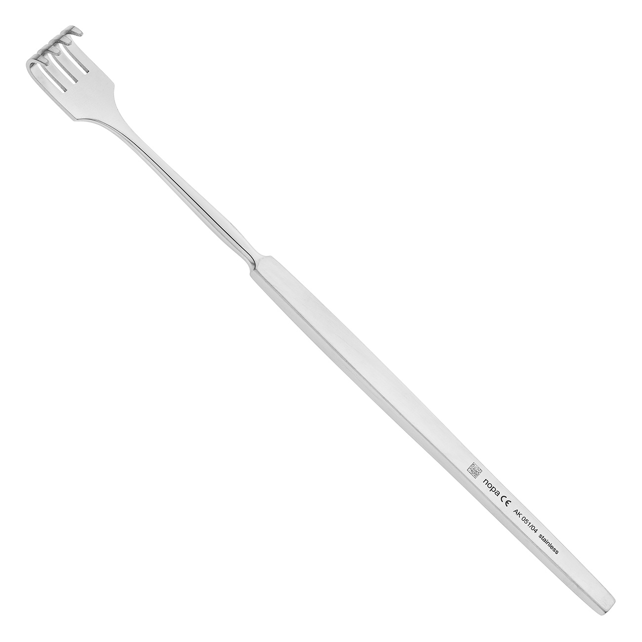 Рабочая часть ретрактора имеет четырёхзубый изогнутый крючок для фиксации слизисто-надкостничного лоскута в заданном хирургом положении. Изгиб по плоскости в рабочей части инструмента обеспечивает хорошую поддержку мягких тканей и делает отведение менее травматичным.