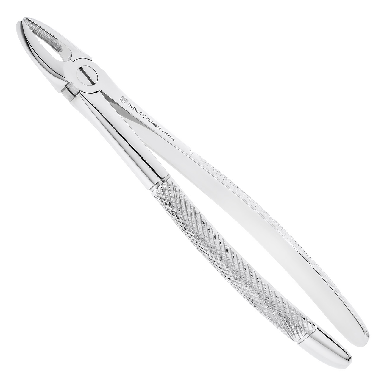 Щипцы формы №2 для удаления резцов и клыков на верхней челюсти изготовлены компанией nopa instruments Medizintechnik GmbH. Рабочие части инструмента имеют прямую форму и находятся в одной плоскости с ручками. Окончание рабочих частей имеет закругленную форму, щечки узкие, не сходящиеся, с внутренней поверхности рабочие части имеют продольно-поперечные насечки. Такая конструкция щипцов позволяет правильно наложить и зафиксировать их на зубе, и при его удалении избежать препятствия со стороны нижней челюсти.
