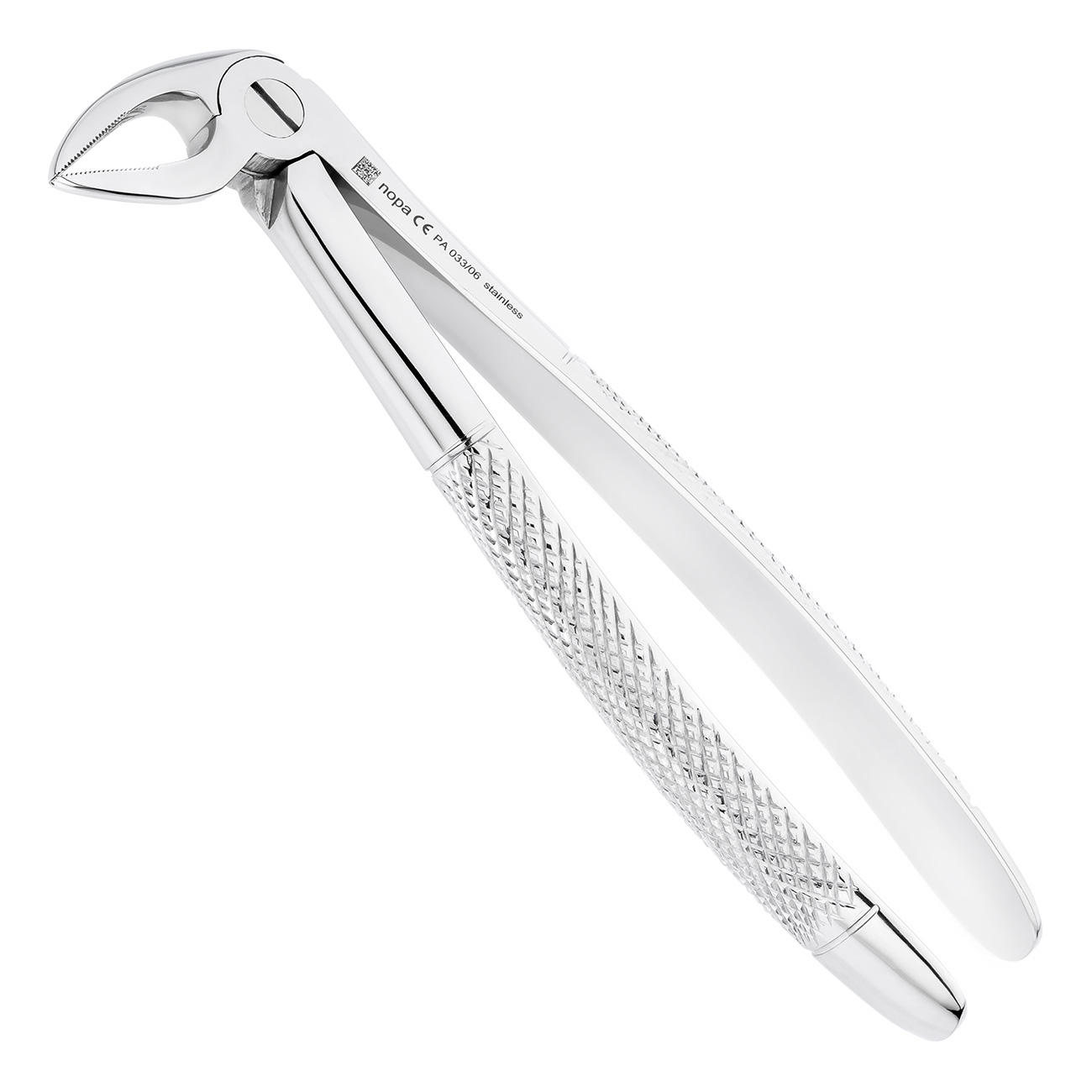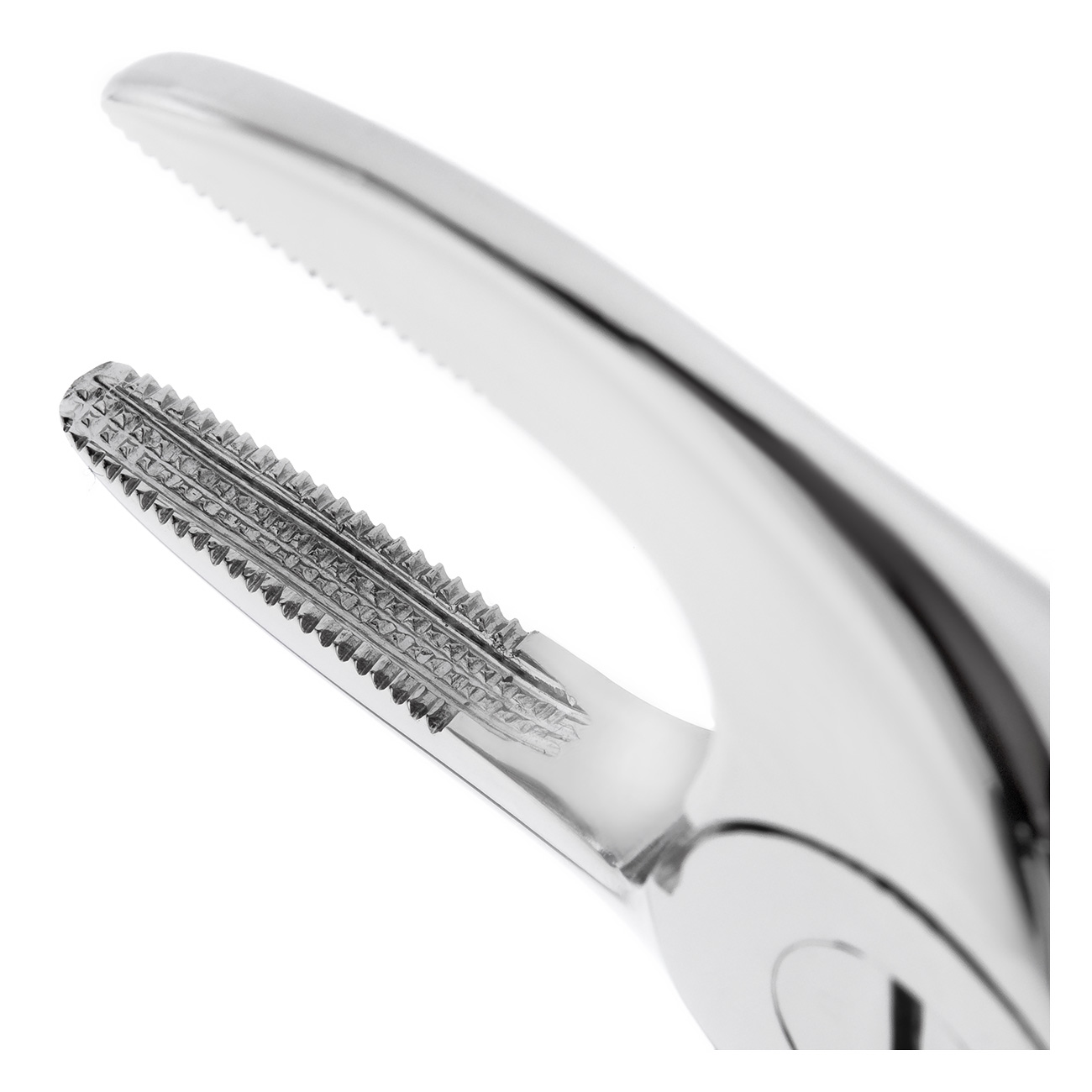 Узкие и удлиненные рабочие части щипцов предназначены для работы с корнями зубов нижней челюсти во всех квадрантах. Продольно-поперечные насечки на внутренних поверхностях щечек инструмента обеспечивают надежную фиксацию щипцов на корне зуба.