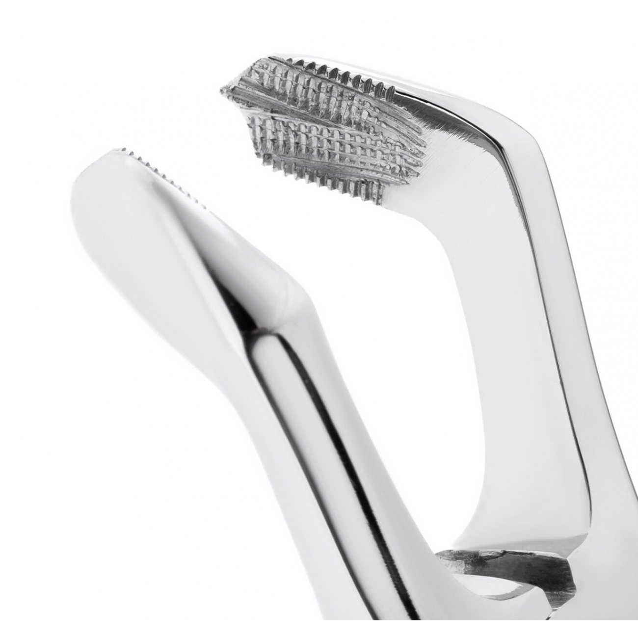 Рабочие части вертикально-изогнутого инструмента с продольно-поперечными насечками не сходящиеся и имеют шип на внутренней поверхности, погружаемый в область бифуркации. Щипцы имеют изгиб по плоскости под тупым углом к продольной оси инструмента, благодаря чему есть возможность ввести щипцы глубоко в дистальный отдел.