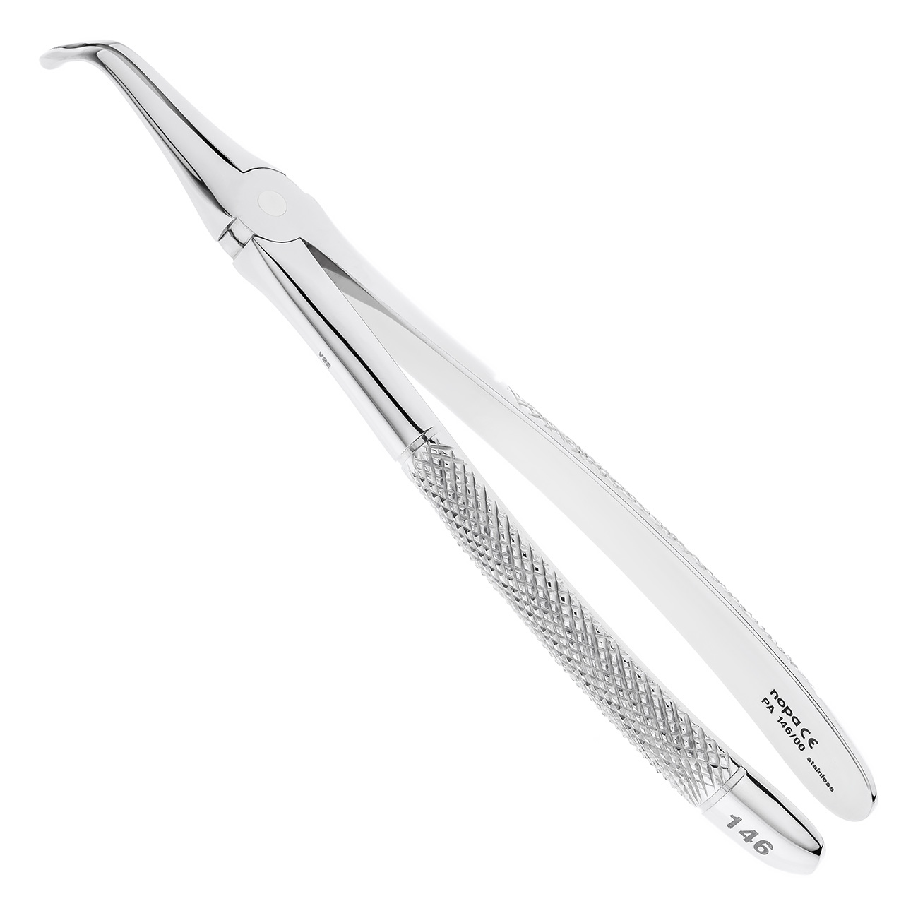 Вертикально-изогнутые щипцы формы №146 изготавливаются немецким производителем nopa instruments Medizintechnik GmbH и применяются для удаления корней зубов на нижней челюсти.
