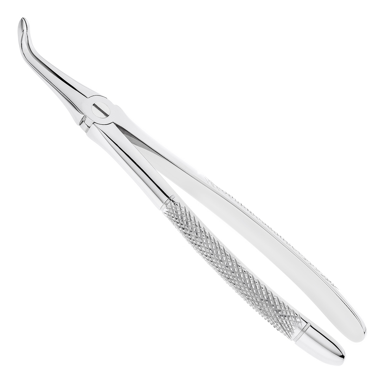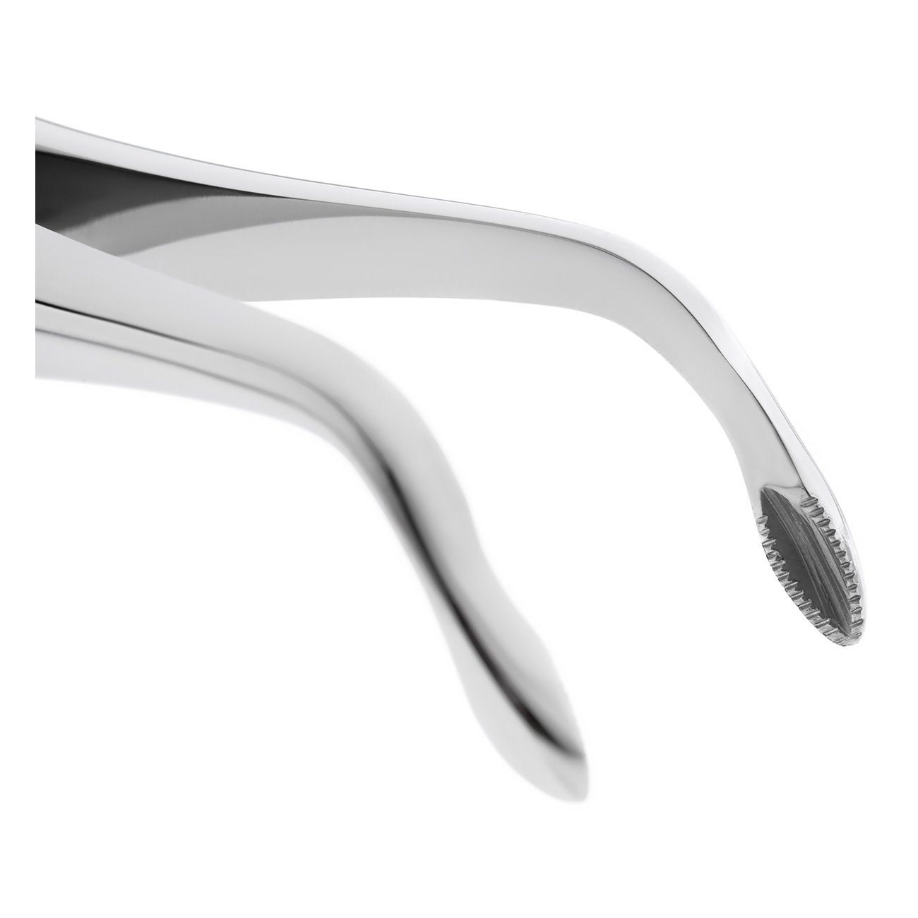 Внутренняя поверхность рабочей части имеет каплевидную форму со сходящимися, острыми, режущими гранями. Такая конструкция щечек обеспечивает плотный захват корня и облегчает его удаление. Изгиб по плоскости в рабочей части дает возможность ввести щипцы глубоко в полость рта.