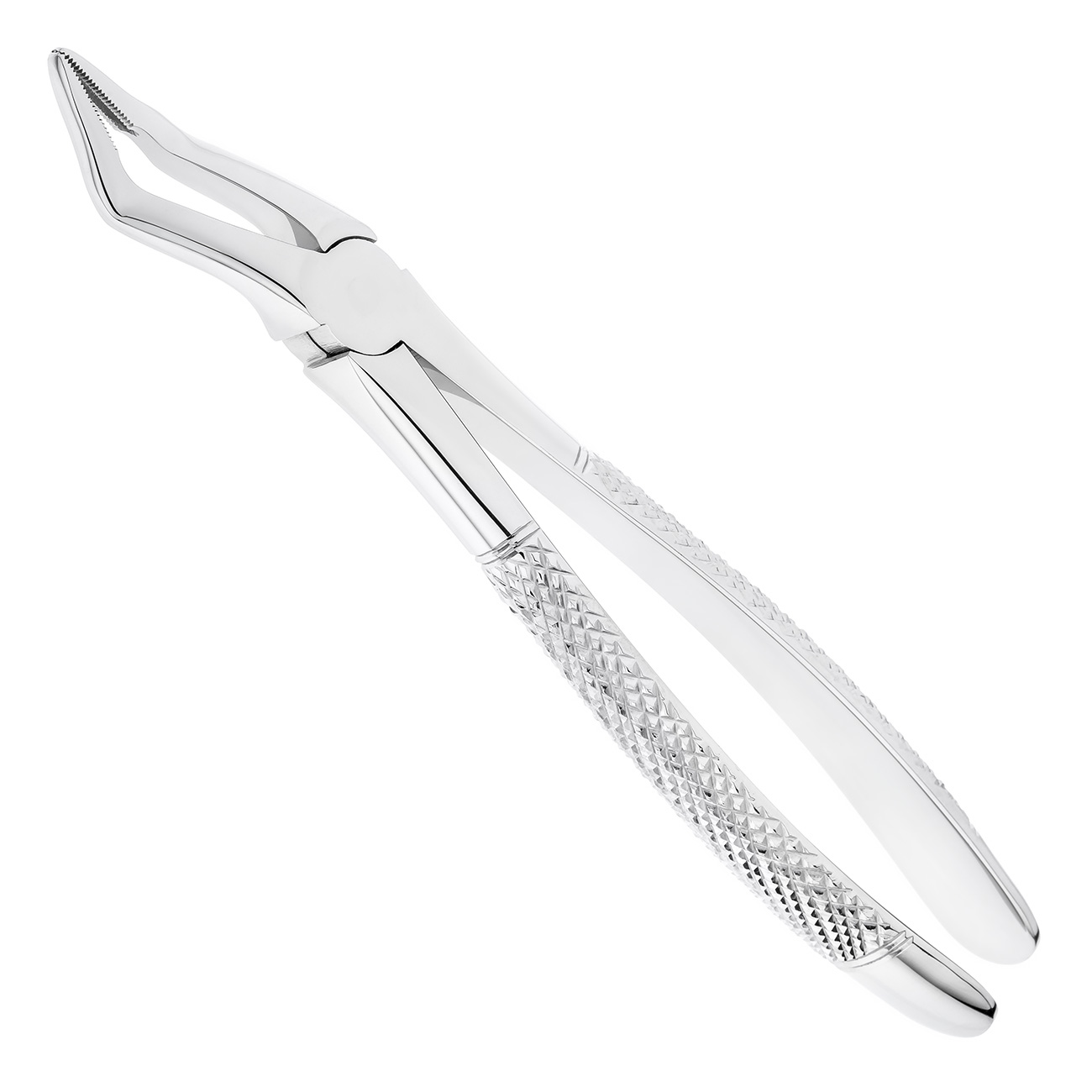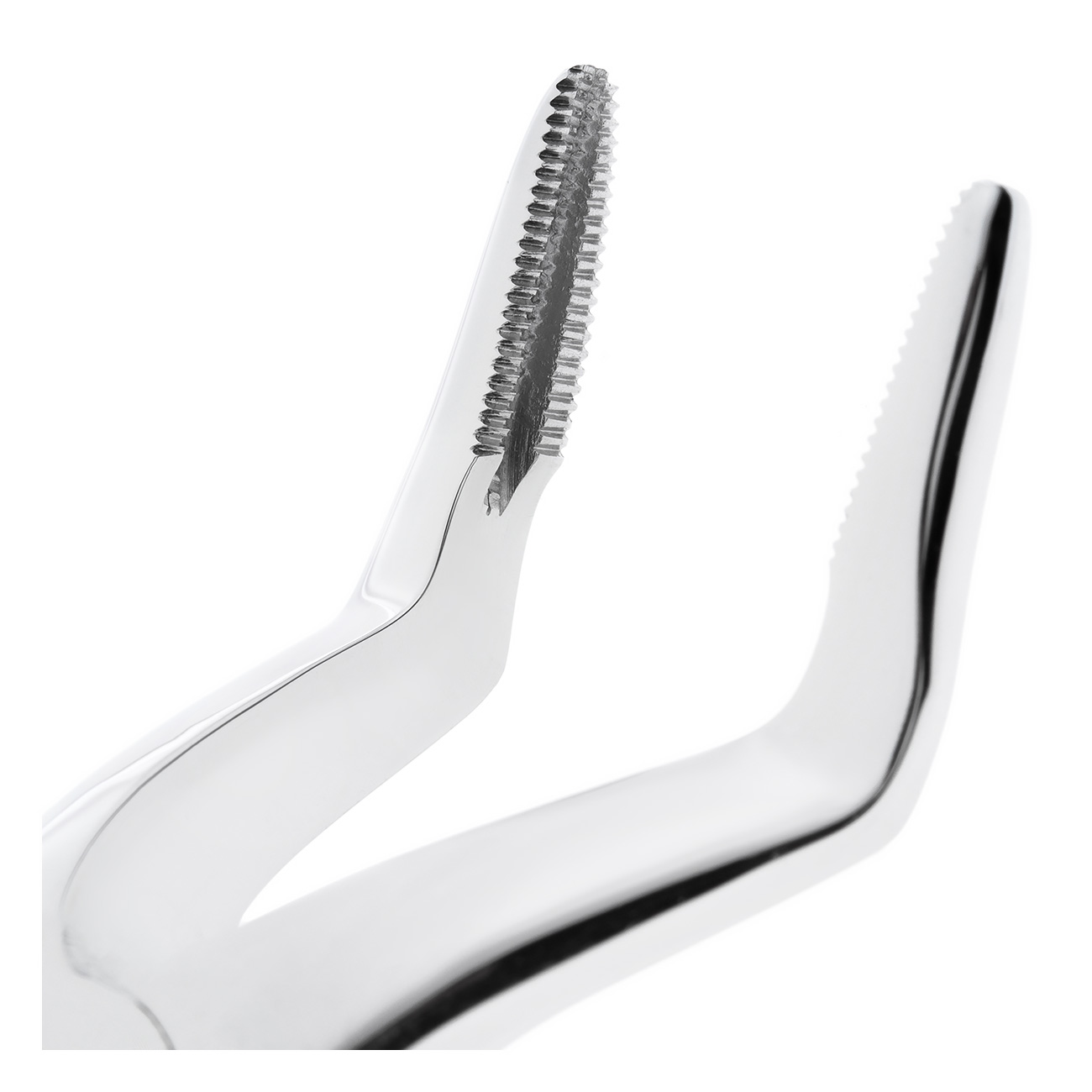 Байонетная рабочая часть щипцов имеет узкую и длинную форму, сходящиеся на конце щечки, а также продольно-поперечные насечки на внутренней поверхности. Такая конструкция инструмента облегчает доступ к корням зубов при работе в любом квадранте верхней челюсти.