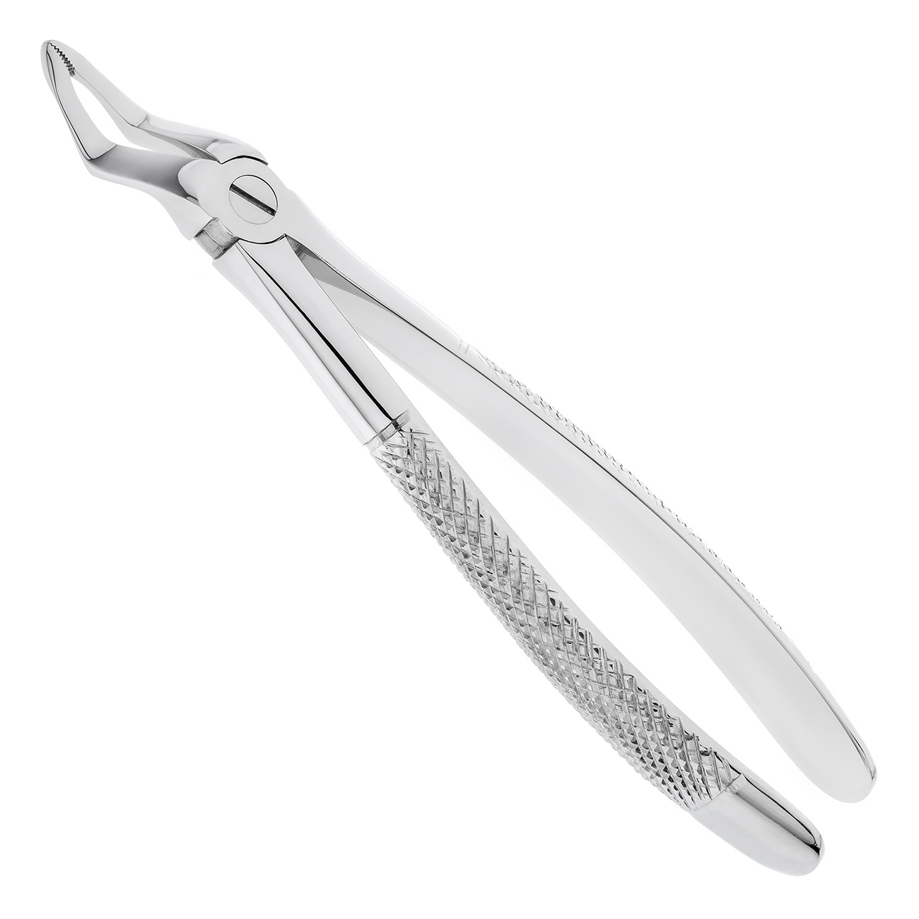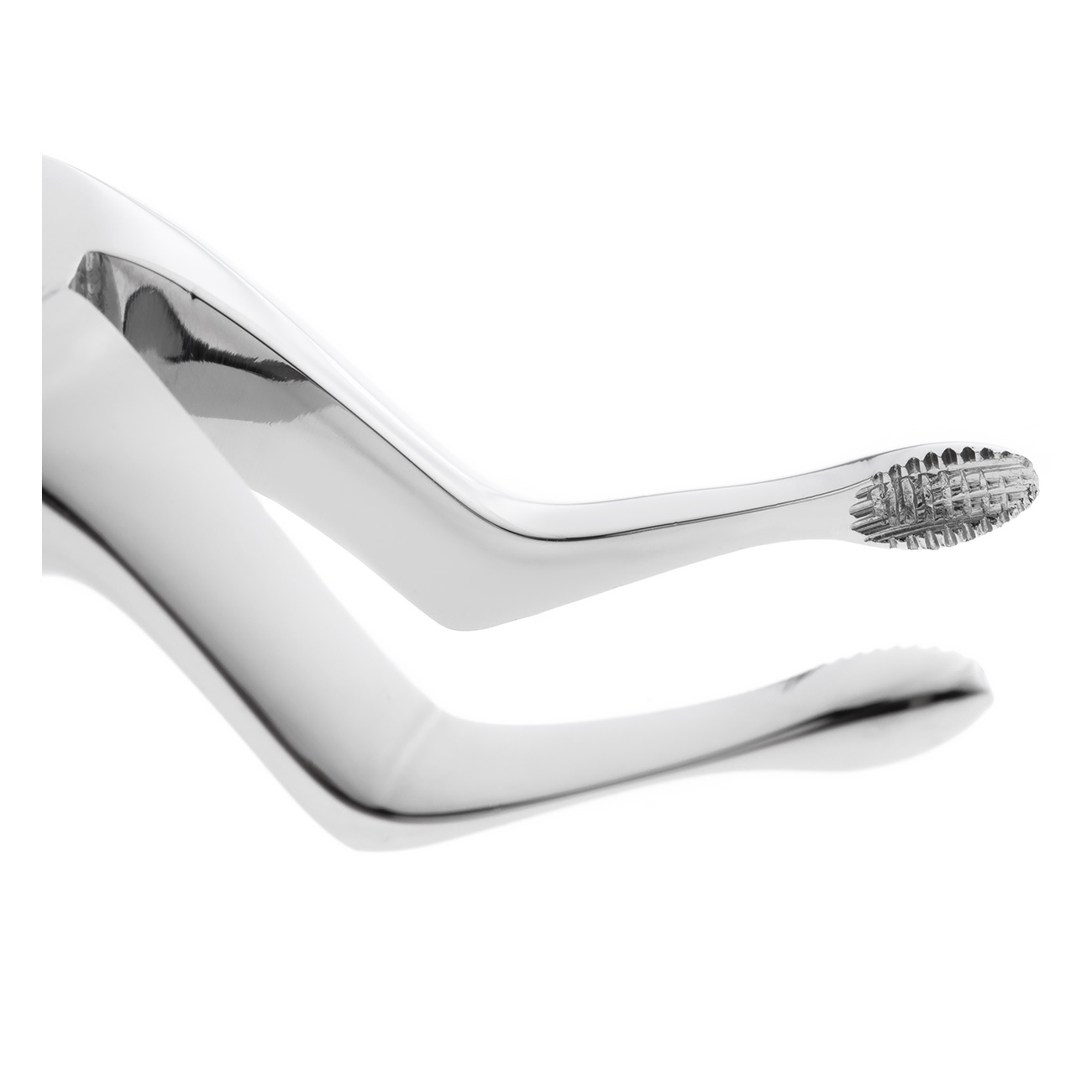 Внутренняя поверхность рабочей части имеет каплевидную форму со сходящимися, острыми, режущими гранями. Такая конструкция щечек обеспечивает плотный захват корня и облегчает его удаление. Изгиб по плоскости в области рабочей части дает возможность ввести щипцы глубоко в полость рта, а нижняя челюсть при этом не препятствует проведению операции.