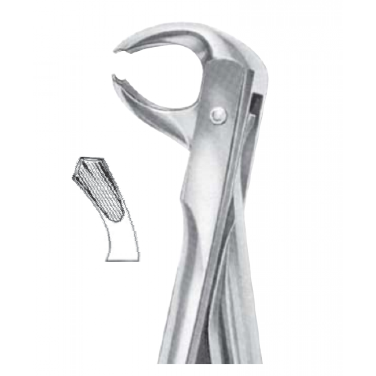 Изогнутые несходящиеся щечки с шипами обеспечивают оптимальный охват нижних моляров левой стороны челюсти и быструю экстракцию. Для лучшего приложения силы щипцы оснащены длинными эргономичными рукоятками с перекрестной насечкой.