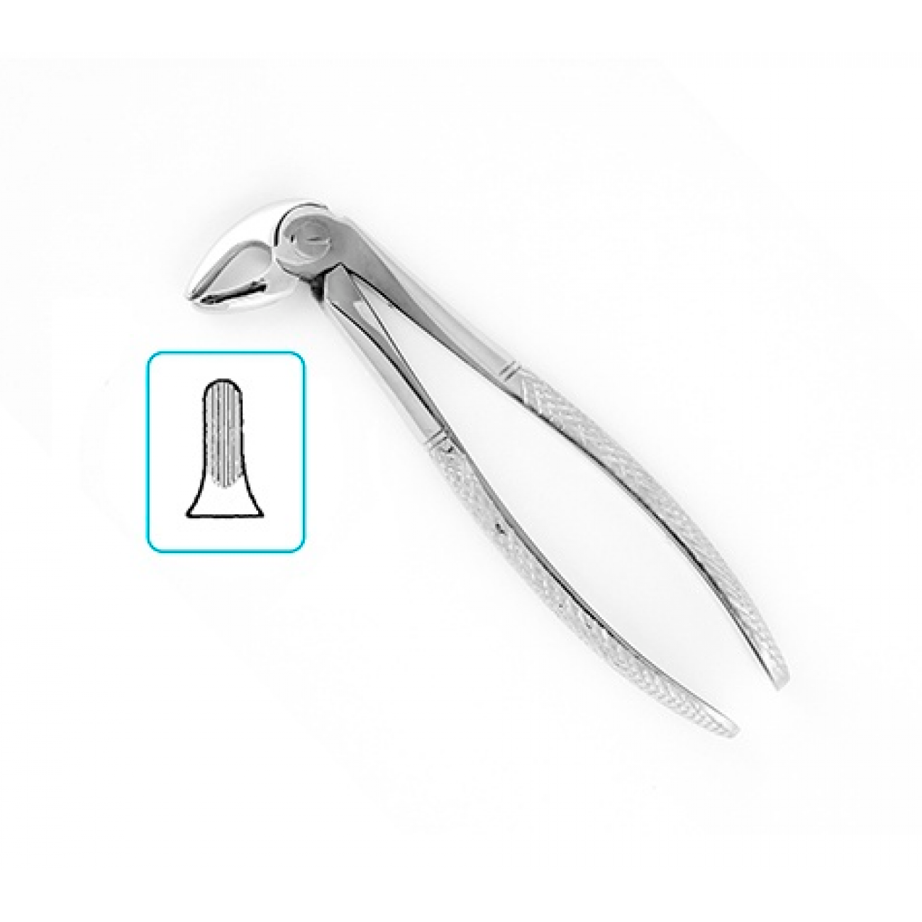 Уменьшенный инструмент не цепляется за губы и не загораживает обзор при проведении процедур в ротовой полости малого размера. Расположенные под прямым углом неходящиеся щечки обеспечивают оптимальный охват премоляров и зубов фронтальной группы, а также быструю экстракцию. Для лучшего приложения силы щипцы оснащены длинными эргономичными рукоятками с перекрестной насечкой.