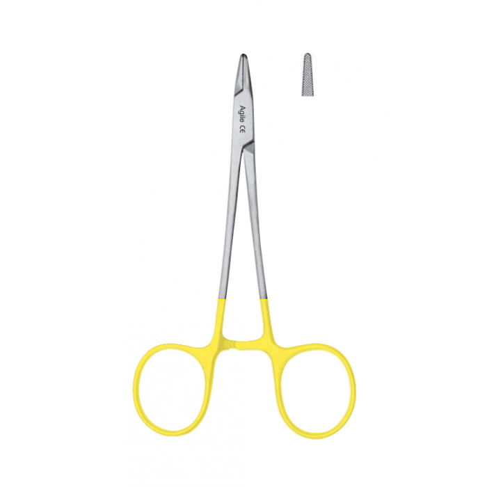 Хирургический прямой иглодержатель Derf AGILE 07-228 PRO - небольшой стоматологический инструмент с короткими губками, предназначенный для наложения тонких швов внутри полости рта с применением тонких игл и шовных материалов размером от 3/0 до 6/0.