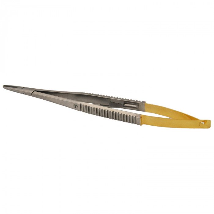 Тонкая рабочая часть иглодержателя 07-243 с тупым концом улучшает видимость и меньше повреждает окружающие операционное поле ткани. Насечка на рукояти препятствует скольжению инструмента в перчатках при введении и выведении пинцета из полости рта.