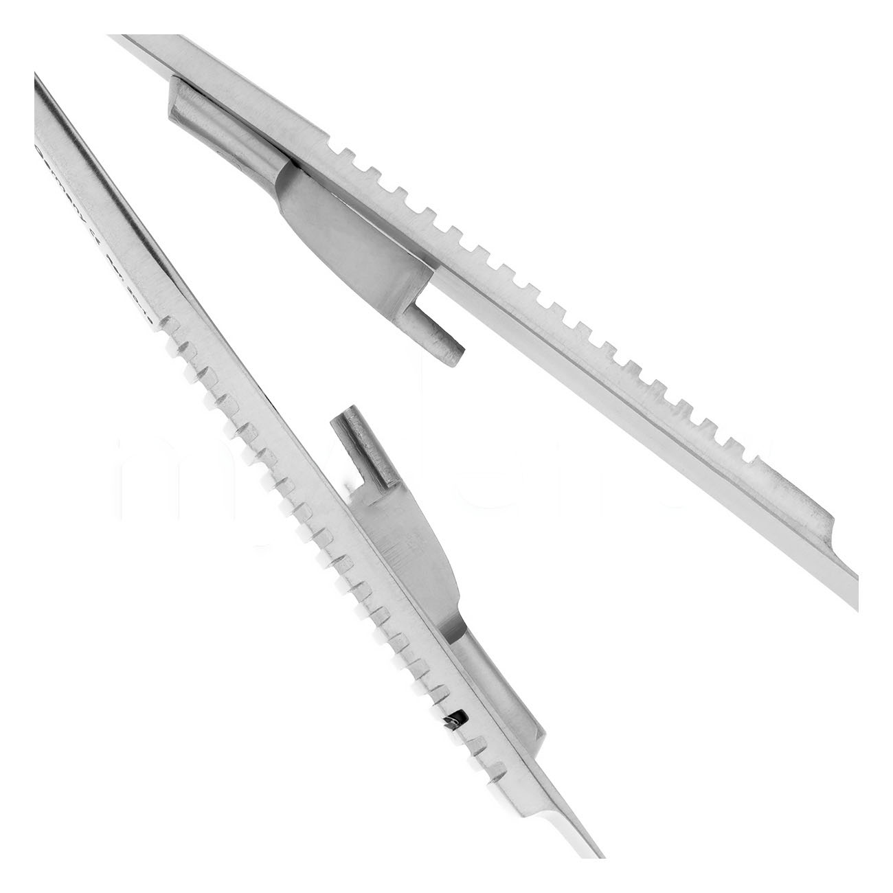 Игла фиксируется на месте при помощи плоских пружин. Щечки с диагональной насечкой помогут надежно удержать тонкую иглу при прохождении сквозь грубые ткани десны.