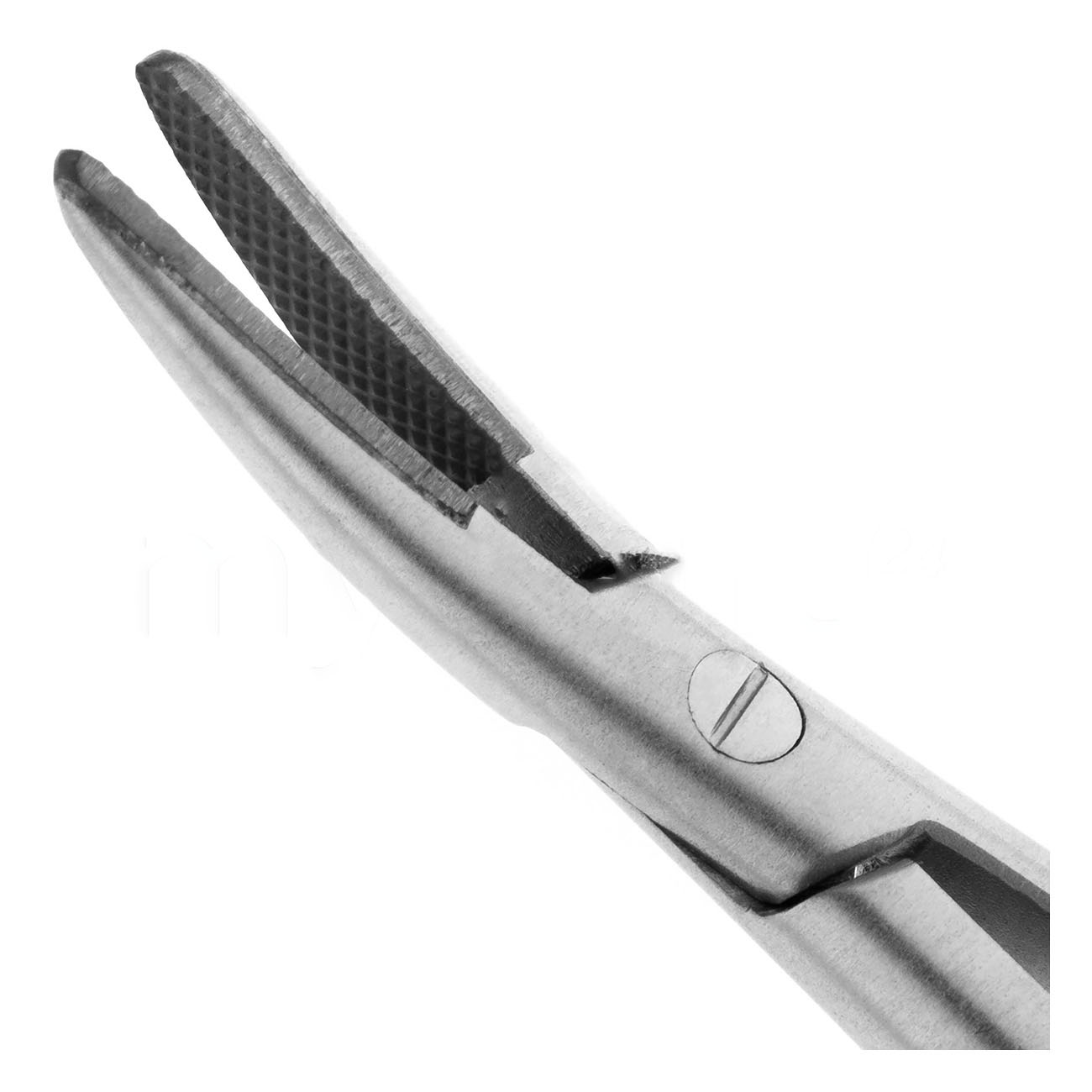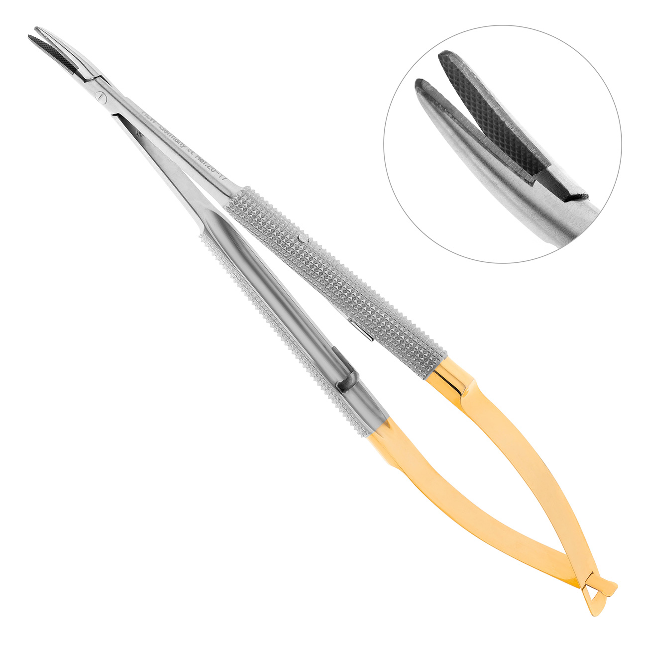 Игла фиксируется на месте при помощи плоских пружин. Щечки с диагональной насечкой помогут надежно удержать тонкую иглу при прохождении сквозь грубые ткани десны. Твердые вставки из карбида вольфрама на рабочей части иглодержателя отличаются устойчивостью к износу и значительно продлевают срок службы инструмента.