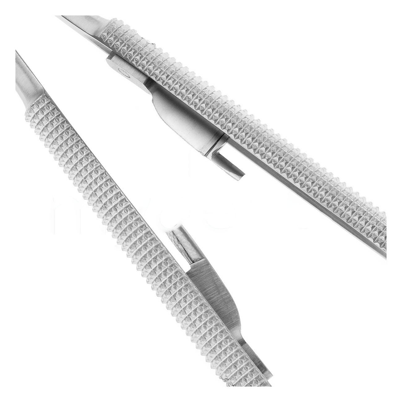 Игла фиксируется на месте при помощи плоских пружин. Щечки с диагональной насечкой помогут надежно удержать тонкую иглу при прохождении сквозь грубые ткани десны. Твердые вставки из карбида вольфрама на рабочей части иглодержателя отличаются устойчивостью к износу и значительно продлевают срок службы инструмента.