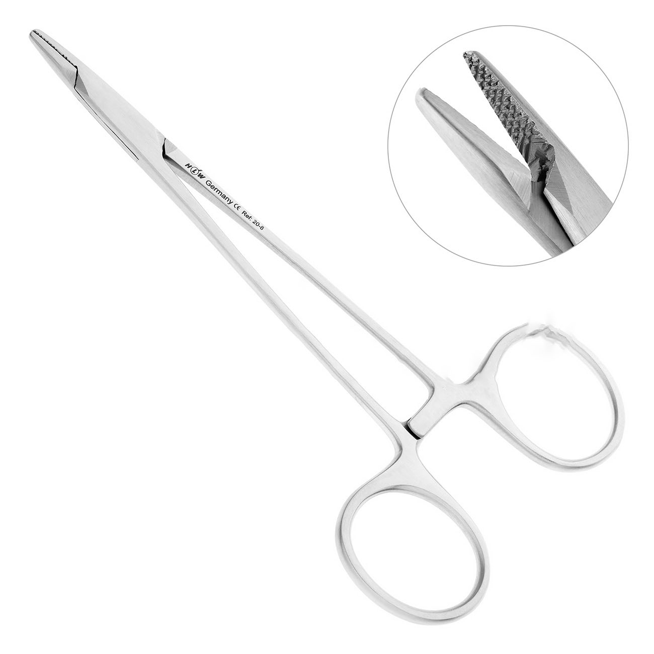 "Назначение:" предназначен для удержания хирургической иглы во время проведения операций. Изогнутая форма обеспечивает удобство и точность при работе.