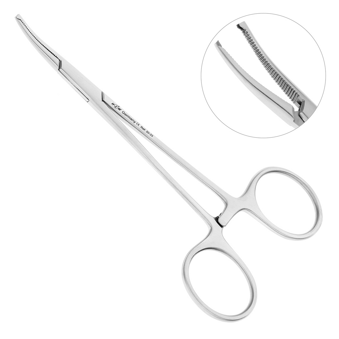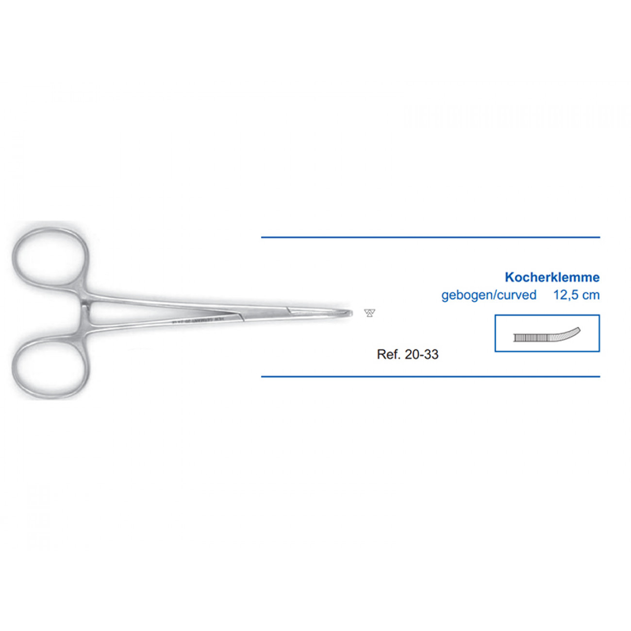 "20-33 Зажим изогнутый 12,5 см, Kocherklemme хирургический с зубчиками" — это высококачественный инструмент, предназначенный для использования в хирургической стоматологии.