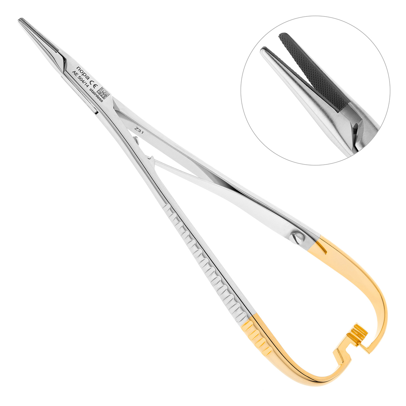Изогнутые рабочие части инструмента имеют вытянутую узкую форму, облегчающую захват и освобождение иглы, в том числе, на труднодоступных участках полости рта. Благодаря насечкам на внутренних поверхностях щечек иглодержателя инструмент надежно фиксируется и не скользит по плоскости хирургической иглы при наложении шва. Вставки из твердого сплава карбид-вольфрама на внутренних поверхностях щечек иглодержателя обеспечивают повышенную устойчивость к истиранию.