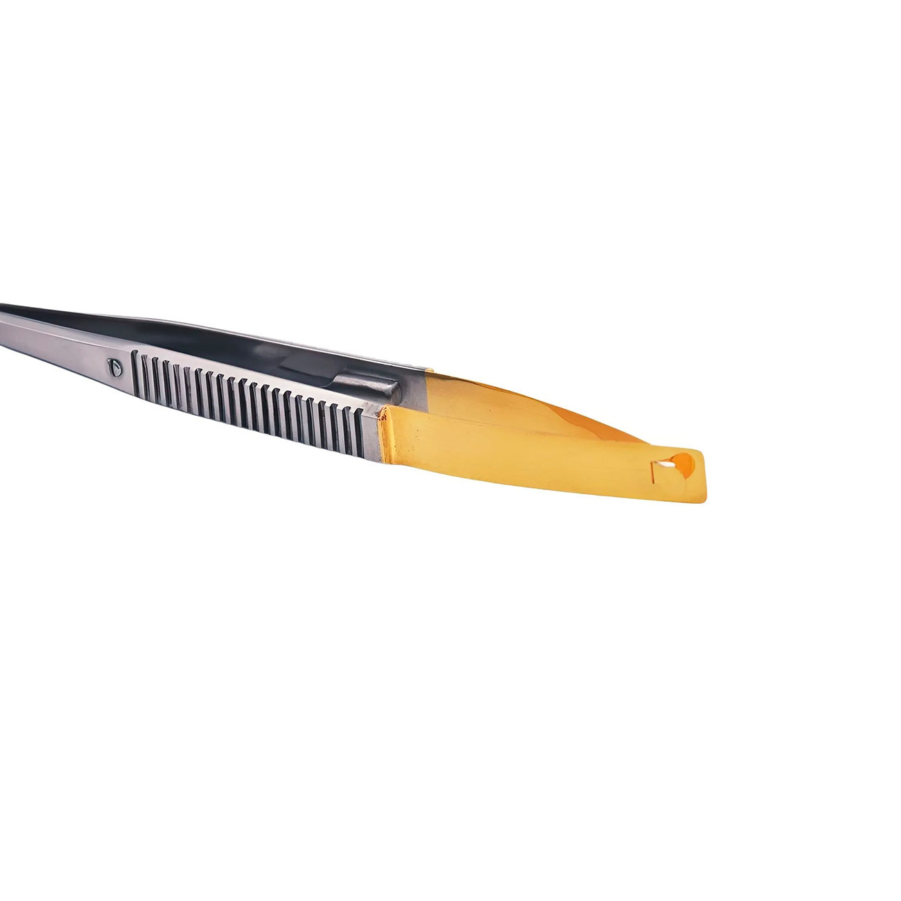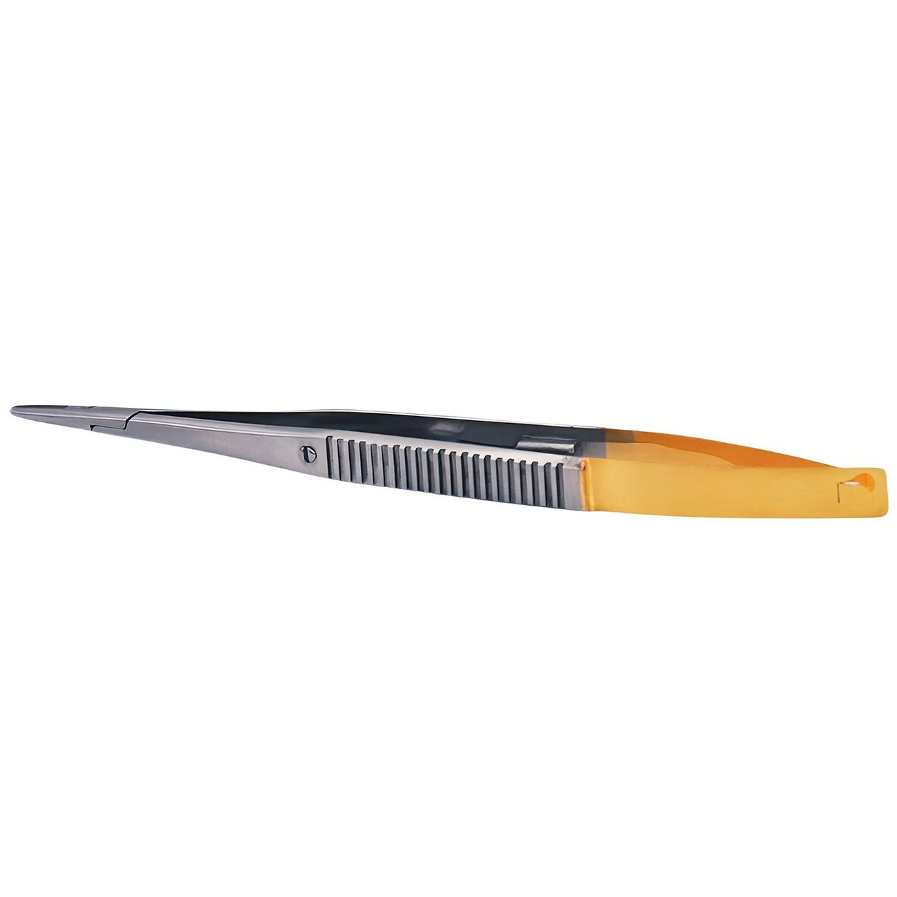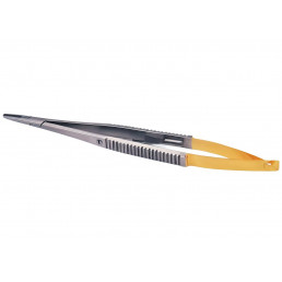 Тонкая рабочая часть иглодержателя 07-243 с тупым концом улучшает видимость и меньше повреждает окружающие операционное поле ткани. Насечка на рукояти препятствует скольжению инструмента в перчатках при введении и выведении пинцета из полости рта.