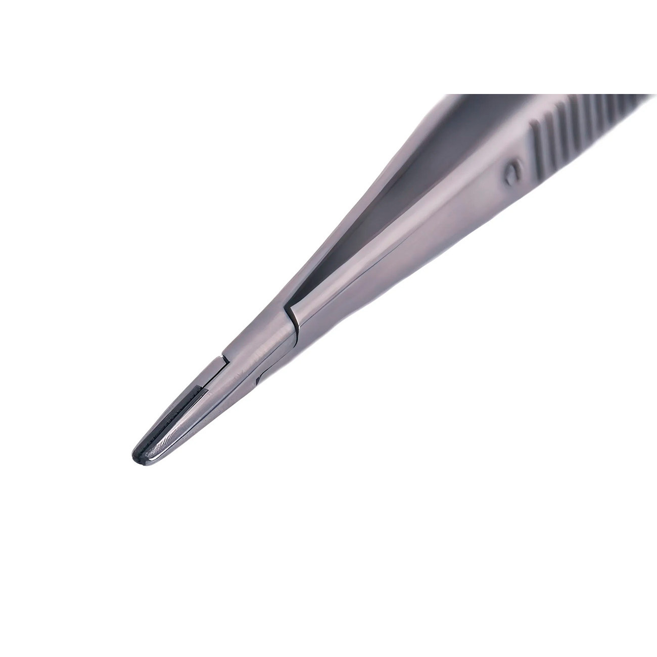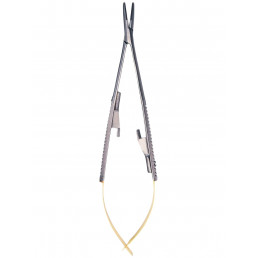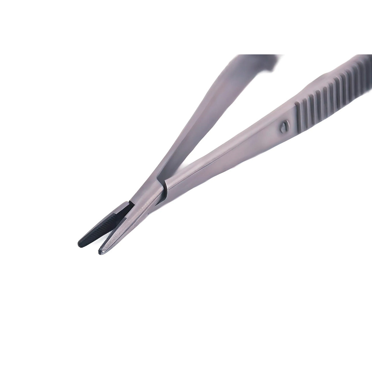 Игла фиксируется на месте при помощи специального фиксирующего механизма, рассчитанного на долговременное удержание мягких тканей рта без постоянного давления. Щечки с диагональной насечкой помогут надежно удержать тонкую иглу при прохождении сквозь грубые ткани десны. Твердые вставки из карбида вольфрама на рабочей части иглодержателя отличаются устойчивостью к износу и значительно продлевают срок службы инструмента.