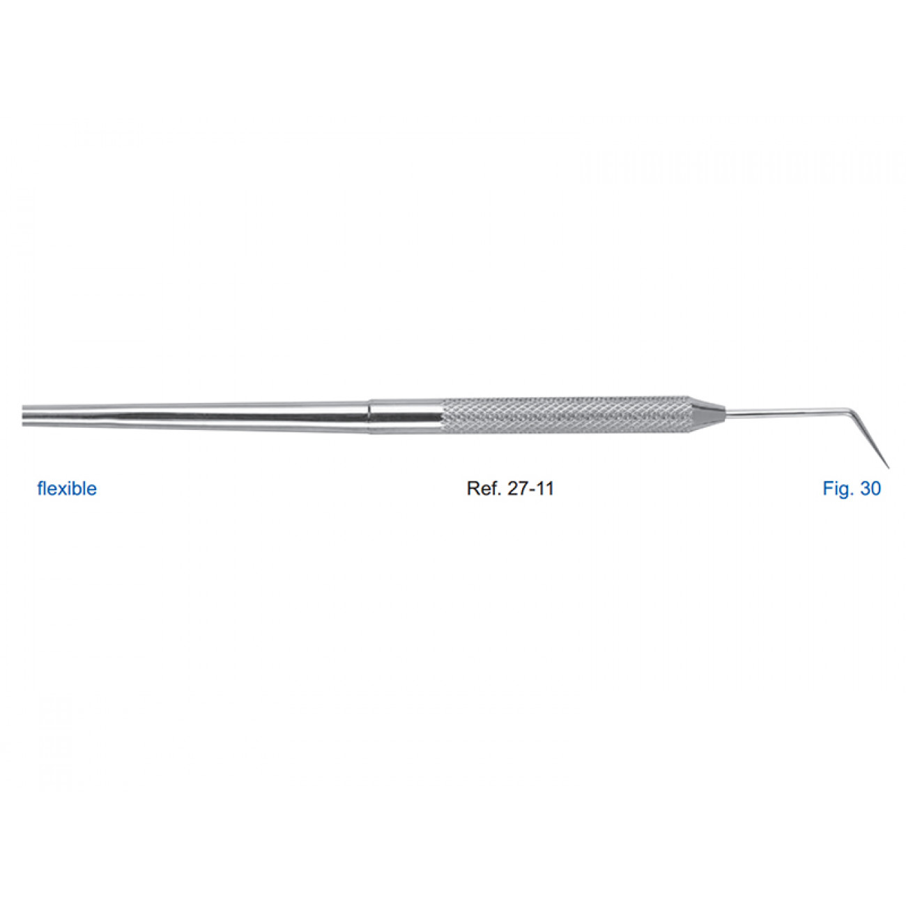 Стоматологический односторонний изогнутый зонд-эксплорер HLW 27-11 с остроконечной рабочей частью повышенной гибкости используется для исследования внутренних поверхностей кариозных полостей, а также для обследования фиссур зубов на предмет зубного камня, декальцинации дентина, кариеса, обнаженной пульпы и прочих поражений зубов.