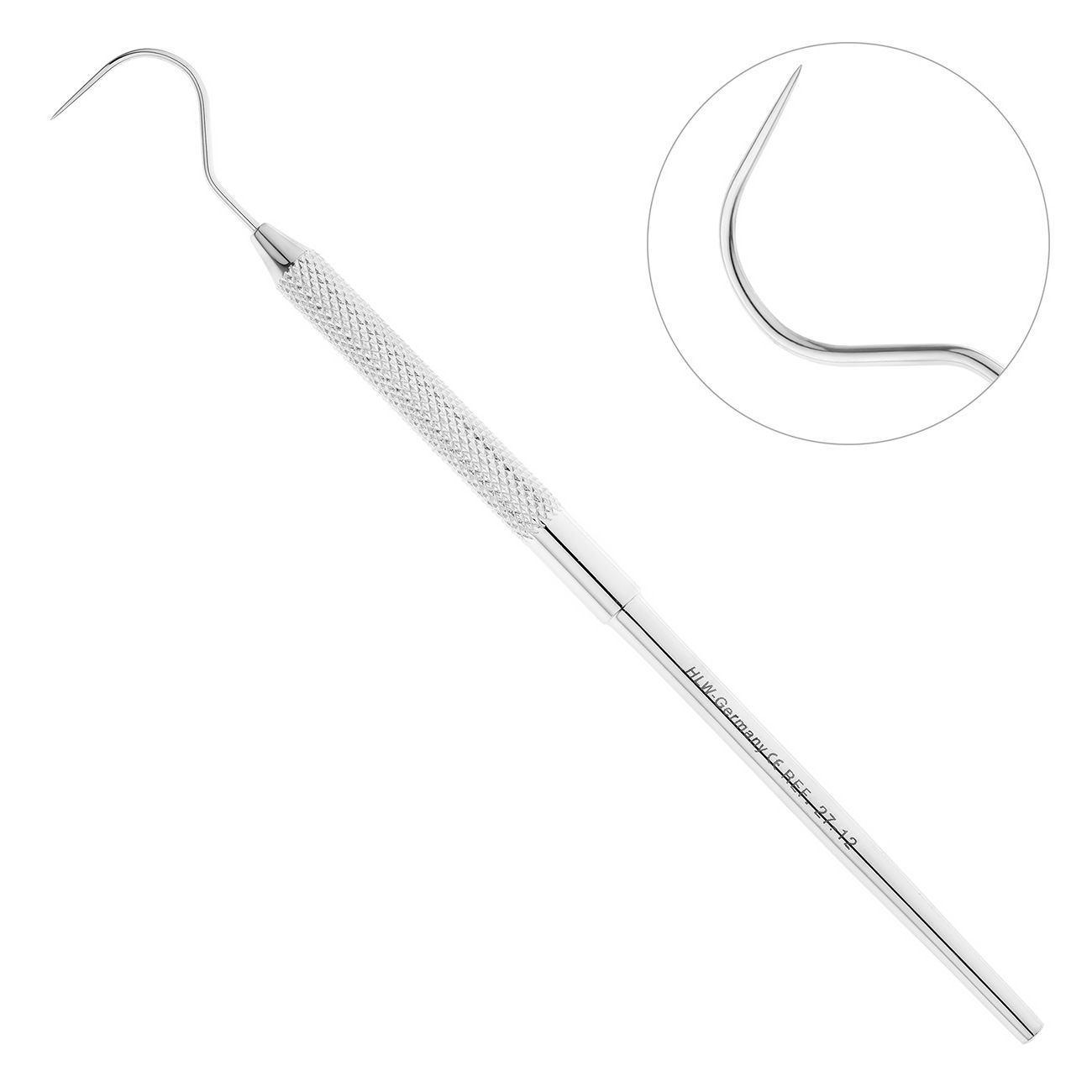 Стоматологический односторонний серповидный зонд-эксплорер HLW 27-12 с остроконечной рабочей частью повышенной гибкости используется для исследования внутренних поверхностей кариозных полостей, а также для обследования фиссур зубов на предмет зубного камня, декальцинации дентина, кариеса, обнаженной пульпы и прочих поражений зубов.