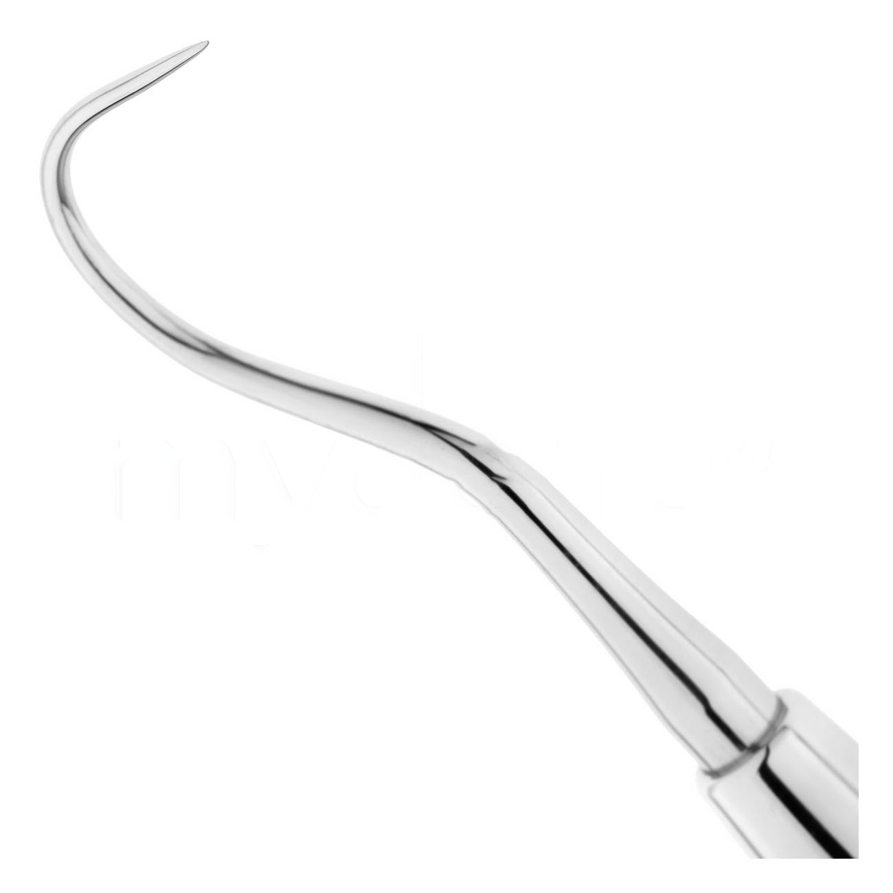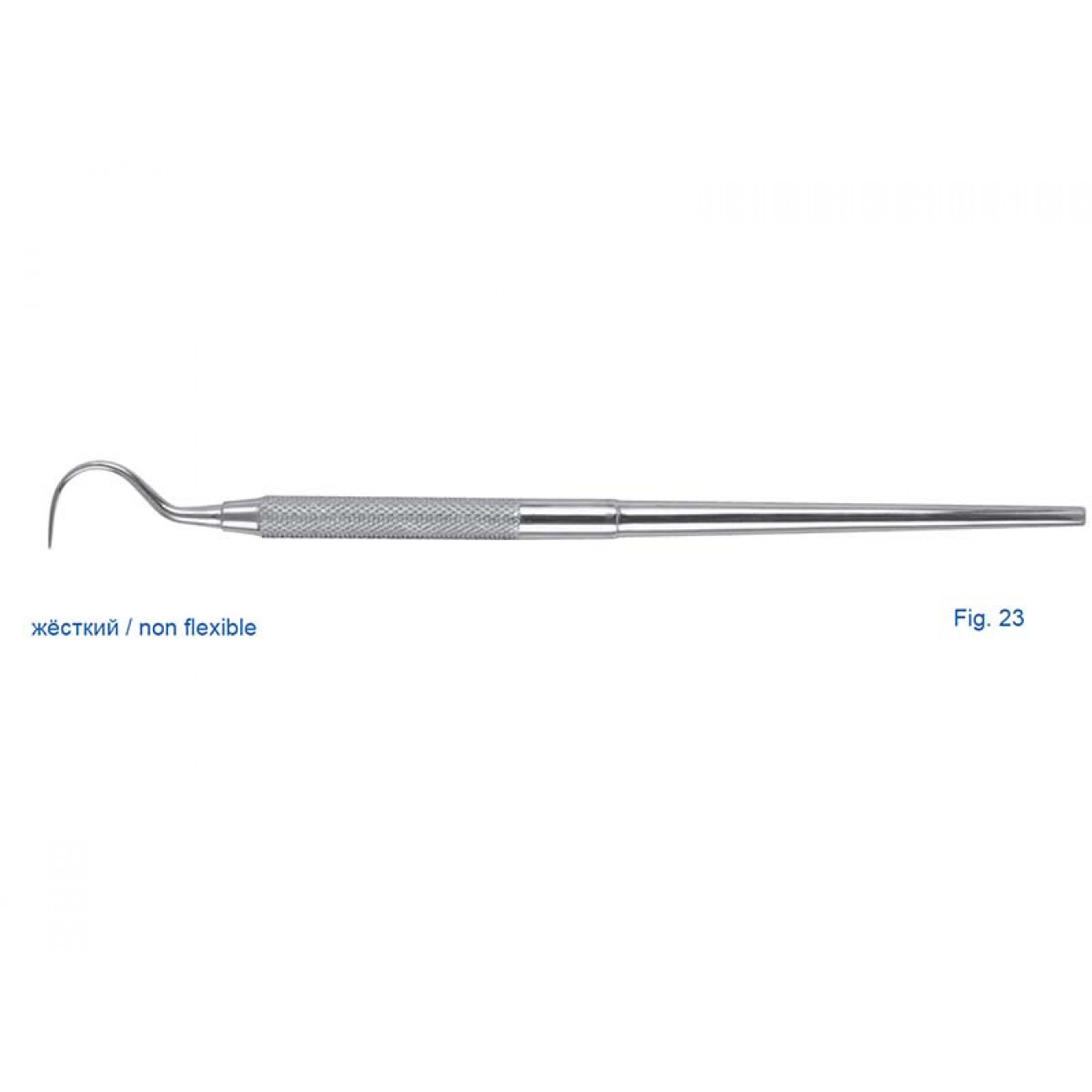 Форма номер 23 отличается длинной серповидной рабочей частью с тонким, не закрывающим обзор кончиком. Инструмент подходит как для осмотра интерпроксимальных поверхностей жевательных зубов, так и для изучения фиссур в глубине полости рта.