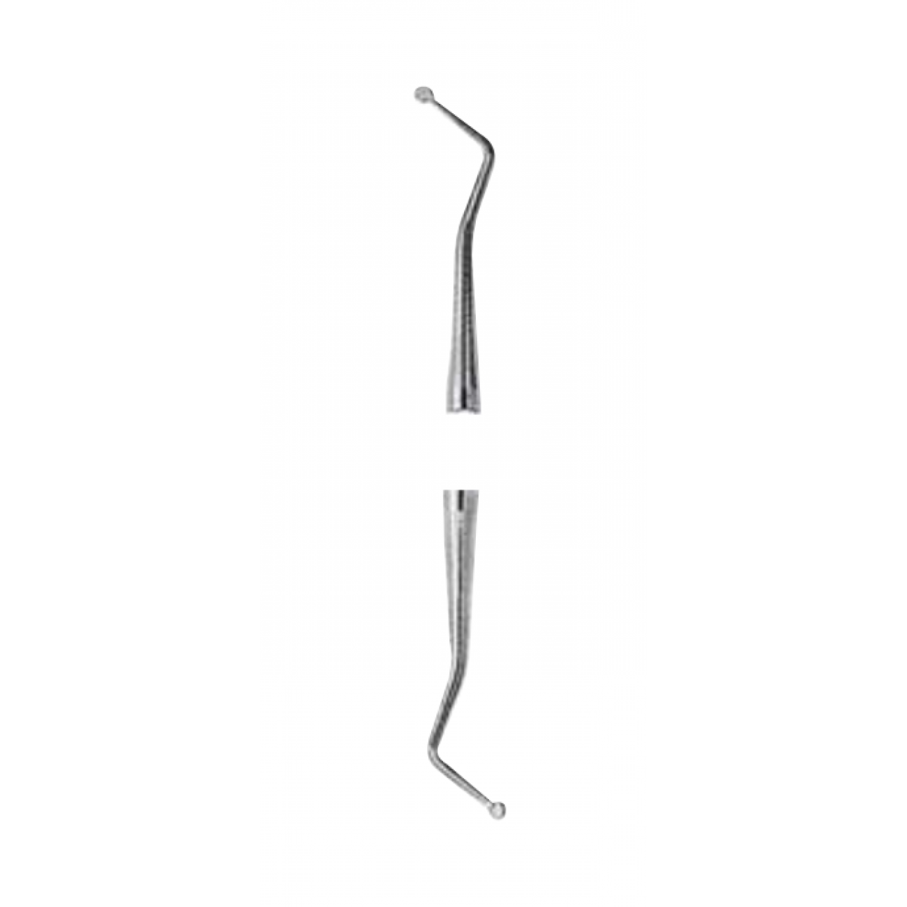 Средний двухсторонний двухугловой экскаватор 03-621 в виде круглой ложки предназначен для удаления пораженных тканей, мягкого налета и остатков временных пломбировочных материалов из кариозных полостей. Инструмент с заостренной кромкой можно применять для выскабливания кариозного дентина в тех случаях, когда препарирование при помощи бора противопоказано.