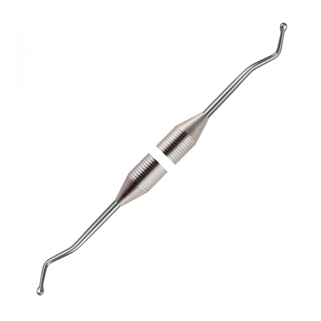 Стоматологический мини экскаватор Экрадент 05-18 - двусторонний инструмент в виде круглой ложки с заостренными краями, предназначенный для выскабливания кариозных полостей на медиальной поверхности зуба в непосредственной близости от пульпы, особенно в тех случаях, когда препарирование полостей при помощи бора противопоказано.