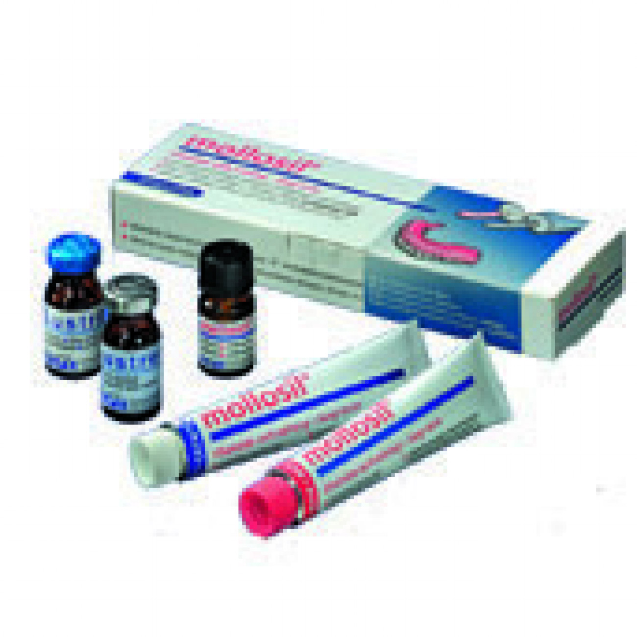 mollosil - долговечный материал для прямой перебазировки протезов на основе А-силикона, мягкопластичный, холодного отверждения. Надежная адгезия на акриловых пласмассах протезов. Для ручного замешивания, дозировка 1:1. Также пригоден для временных немедленных протезов. Биосовместим, антибактериален, обладает нейтральным запахом и вкусом. Может обрабатываться непрямым методом.