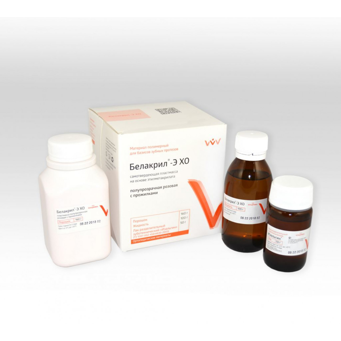 Базисные материалы «Белакрил» выпускаются в виде двух компонентов - порошка, содержащего полиэфиры метакриловой кислоты, катализатор реакции полимеризации перекись бензоила, и жидкости, содержащей мономер метилметакрилат (М) и/или мономер этилметакрилат (Э), после смешивания порошка с жидкостью образуется полимер, твердеющий при нагревании (горячего отверждения) - ГО или без нагревания (самотвердеющий) - ХО. Базисные материалы «Белакрил» отличает высокая технологичность, простота и быстрота изготовления изделий, имеющих высокое качество, функциональную долговечность, натуральный внешний вид и биосовместимость.