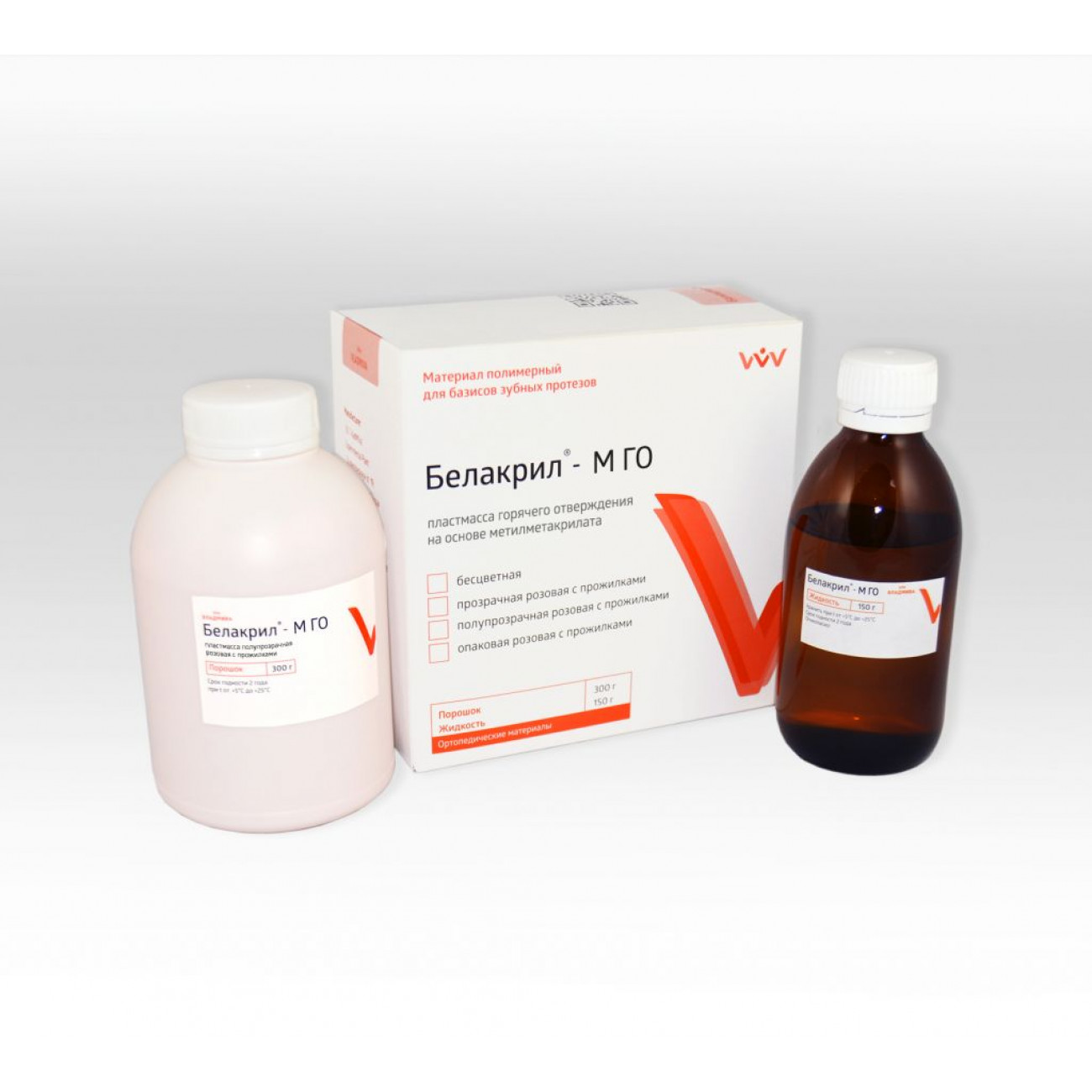 Базисные материалы «Белакрил» выпускаются в виде двух компонентов - порошка, содержащего полиэфиры метакриловой кислоты, катализатор реакции полимеризации перекись бензоила, и жидкости, содержащей мономер метилметакрилат (М) и/или мономер этилметакрилат (Э), после смешивания порошка с жидкостью образуется полимер, твердеющий при нагревании (горячего отверждения) - ГО или без нагревания (самотвердеющий) - ХО. Базисные материалы «Белакрил» отличает высокая технологичность, простота и быстрота изготовления изделий, имеющих высокое качество, функциональную долговечность, натуральный внешний вид и биосовместимость.