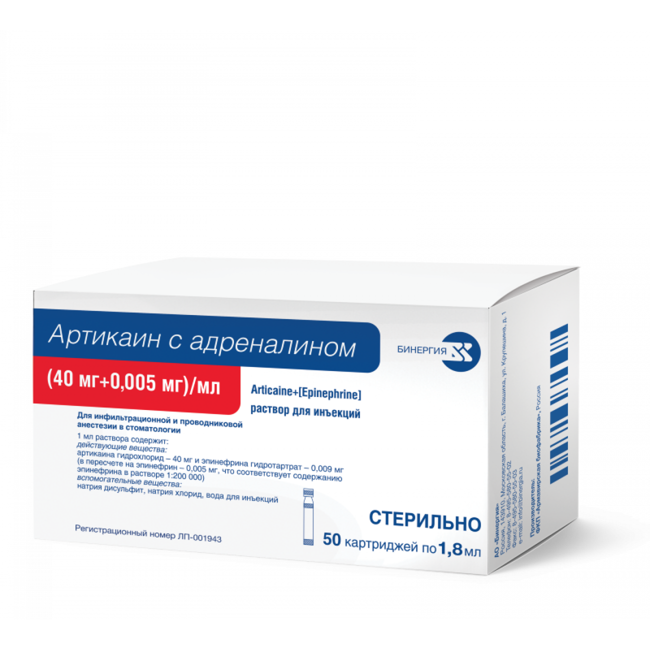 Артикаин Бинергия с адреналином оказывает быстрое (латентный период - от 1 до 3 мин) и сильное анестезирующее действие и имеет хорошую тканевую переносимость.