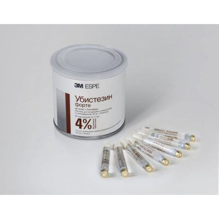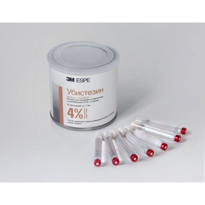 1,8 мл картриджи из прозрачного бесцветного стекла 1 или 2 гидролитического класса, укупоренные с одной стороны плунжерами из эластомерного материала, а с другой стороны комбинированными колпачками для стоматологических картриджей для местной анестезии, состоящими из диска из эластомерного материала и алюминиевого анодированного колпачка.