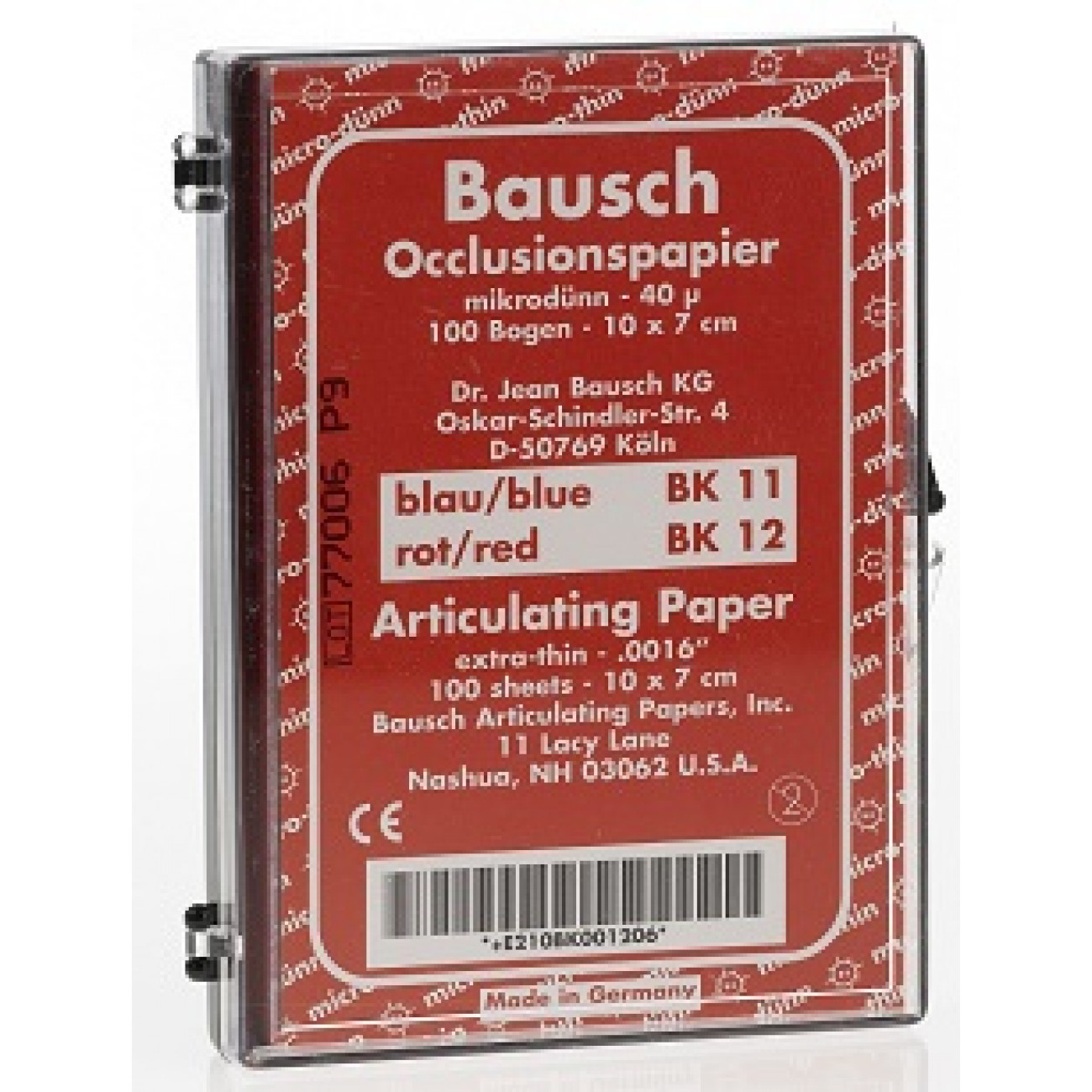 Окклюзионная бумага Бауша микродюн толщиной 40 мкм является очень тонкой и, в то же время, прочной бумагой, которая с обеих сторон покрыта жидкой краской. Малая толщина этой бумаги исключает получение ложных или смазанных контактных пунктов и обеспечивает точные, чёткие цветные отпечатки. Жидкокрасочное покрытие с особенной степенью надёжности выявляет все окклюзионные контакты даже на смоченных слюной золотых, керамических, полированных металлических или пластмассовых поверхностях. Специальное жидкокрасочное покрытие состоит из множества микрокапсул, наполненных краской. Микрокапсулы лопаются даже при незначительном давлении и высвобождают жидкую краску, окрашивая места контактов. Эта бумага может использоваться многократно, так как красящее покрытие обладает способностью к регенерации. Окклюзионная бумага Бауша микродюн толщиной 40 мкм особенно хорошо подходит для двухцветной демонстрации статической и динамической окклюзии. Для этого на первом этапе окрашиваются в красный цвет все контактные пункты в положении центральной окклюзии, а затем проводится второй этап с окраской динамических контактных пунктов в синий цвет. Использование синей бумаги на первом этапе и красной бумаги на втором этапе также даёт хорошие результаты.