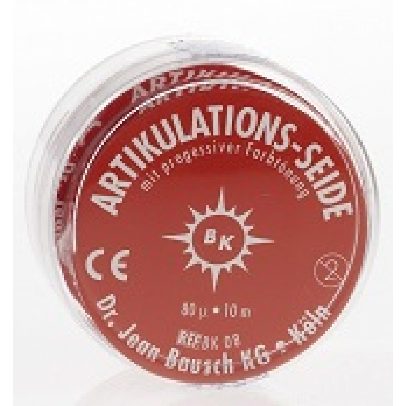 Артикуляционный шёлк Бауша — это высококачественный шёлк с такими же свойствами, как у двухсотмикронной артикуляционной бумаги с нарастающей интенсивностью цвета. Производство: Bausch, Германия.