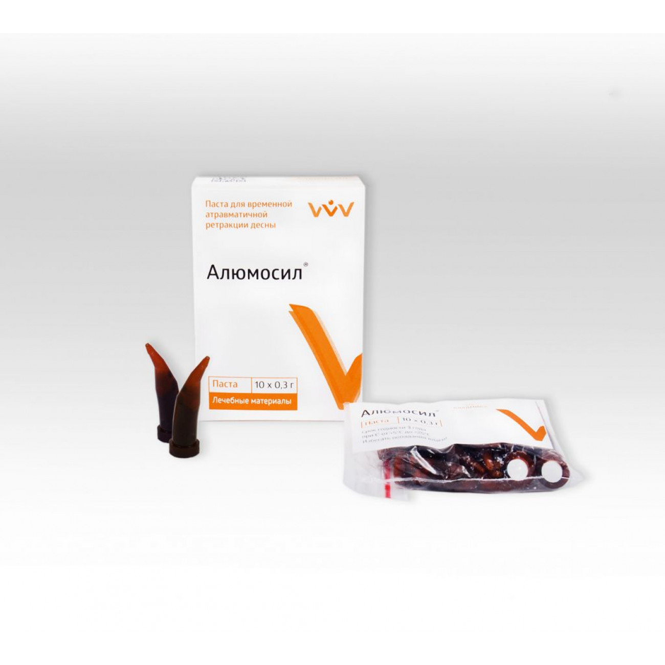 Материал «Алюмосил» представляет собой готовую к применению пасту, обладающую вяжущими и гемостатическими свойствами. Паста «Алюмосил» содержит: алюминий хлористый, определяющий вяжущее, гемостатическое и ретракционное свойства материала; инертный наполнитель, а также вкусовые и технологические добавки.