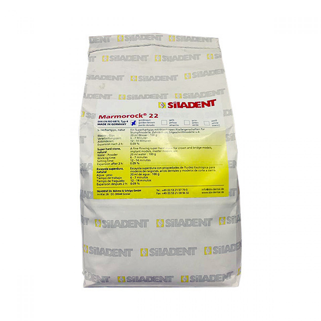 Siladent Marmorock 22 (Марморок 22), цвет золотой коричневый. Сверхтвердый гипс с тиксотропными свойствами текучести и исключительной твердостью. Превосходная стабильность кромки и высокая прочность на сжатие при минимальном расширении, особенно подходит для высококачественного протезирования, универсальное использование благодаря изменяющемуся соотношению вода / гипс.