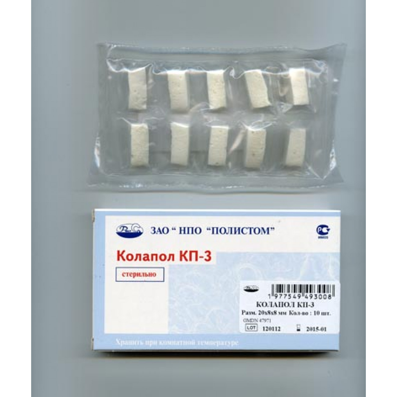 Коллагеновый материал Колапол КП-3 применяется в стоматологической практике для заполнения обширных костных полостей при проведении хирургических операций в стоматологии, включая процедуры синус-лифтинга, цистэктомии, секвестрэктомии, резекции корня, а также для лечения неоднократно прооперированных больных с остеомиелитом челюсти. Колапол КП-3 значительно ускоряет остеогенез и стимулирует заживление костных тканей.